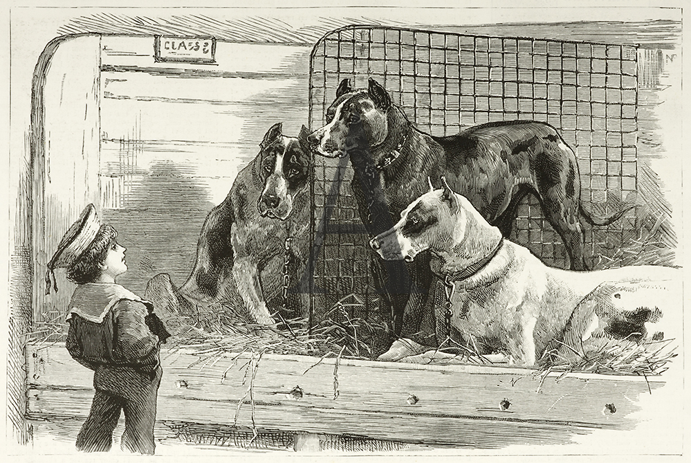 At a Dog Show - The Big Danes and the Little Englishman. - Antique Print from 1887