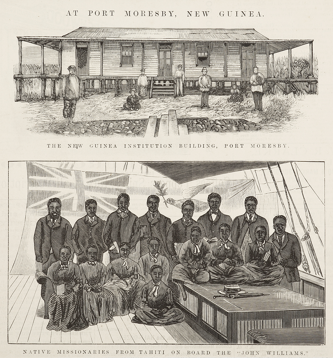 Rare colonial engraving of missionaries at Port Moresby, New Guinea.