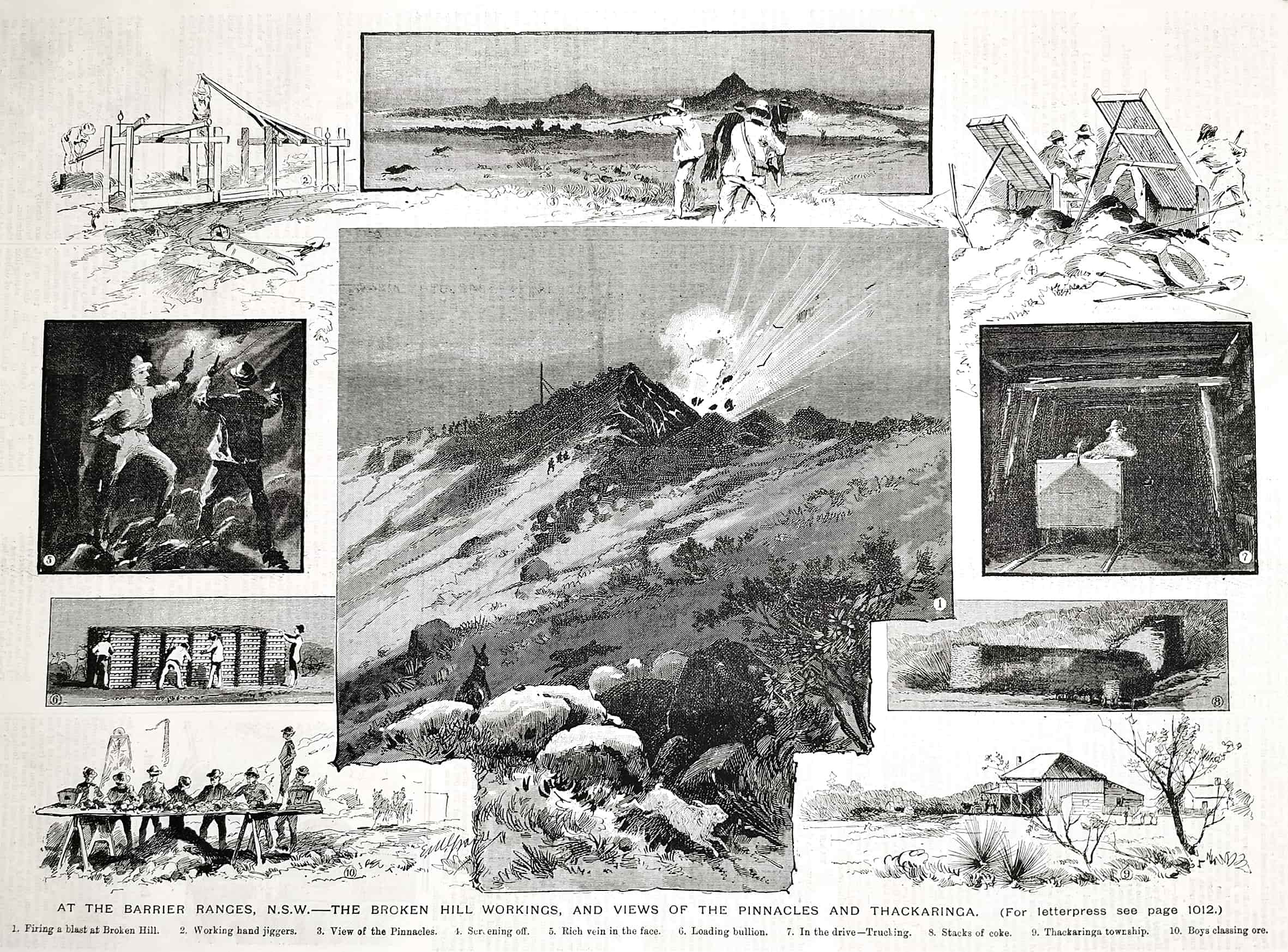 Rare engraving of the Silverton/Broken Hill area of New South Wales. Inset titles; 1. Firing a Blast at Broken Hill. 2. Working hand jiggers. 3. View of the Pinnacles. 4. Screening off. 5. Rich Vein in the face. 6. Loading … Read Full Description