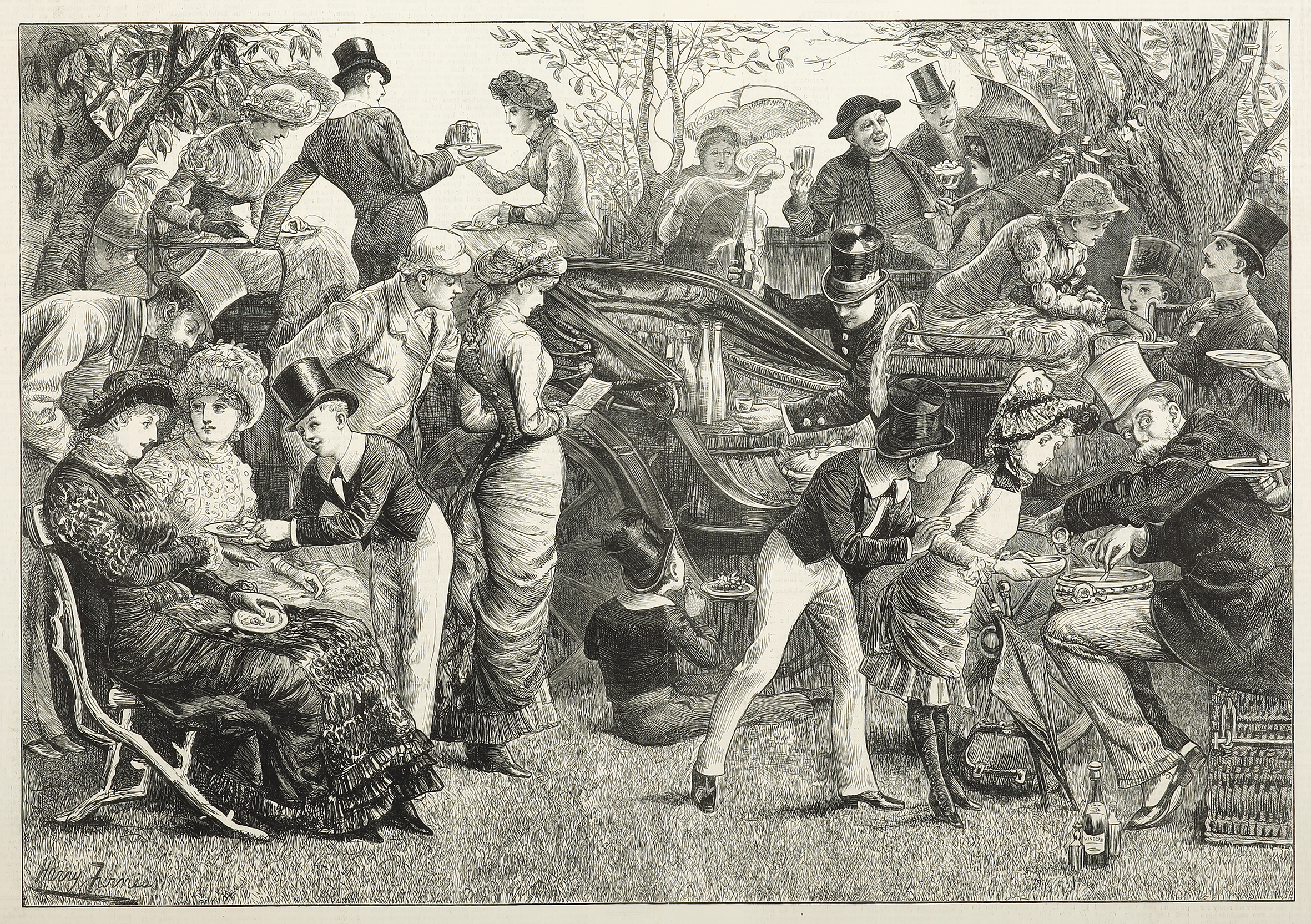 An animated scene of picnickers at the Eton and Harrow cricket match. From the original edition of the Illustrated London News.