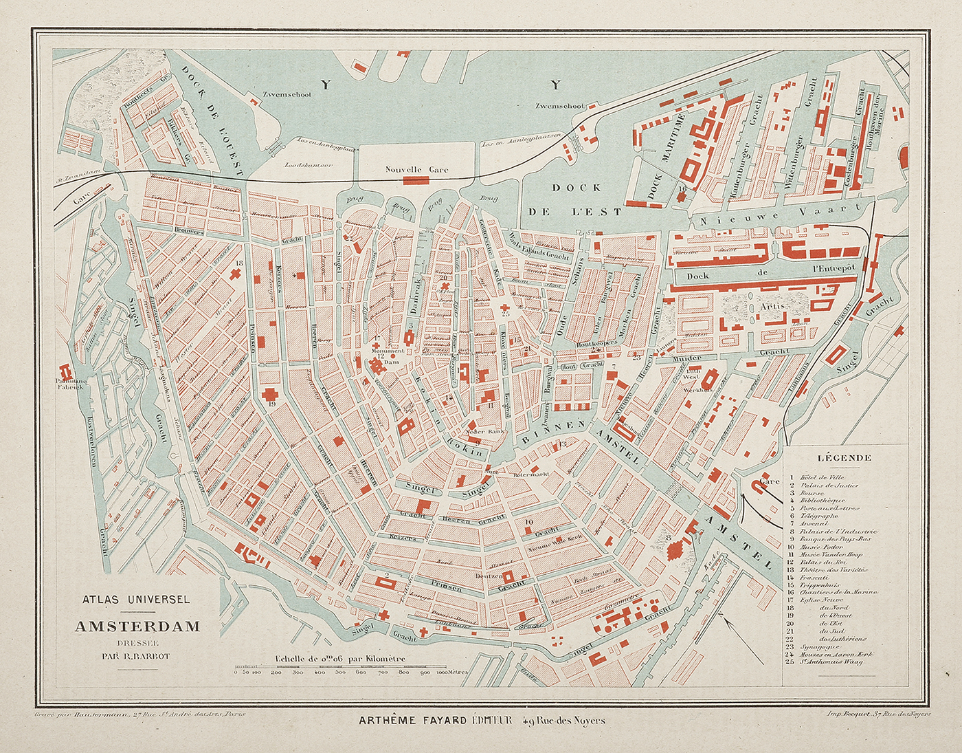 Detailed c.19th French plan of Amsterdam with a key at lower right. From: Fayard, Artheme. Atlas Universel contenant la Gepographie…du Monde Collections: Bibliotheque Nationale de France: ark:/12148/bpt6k6569199