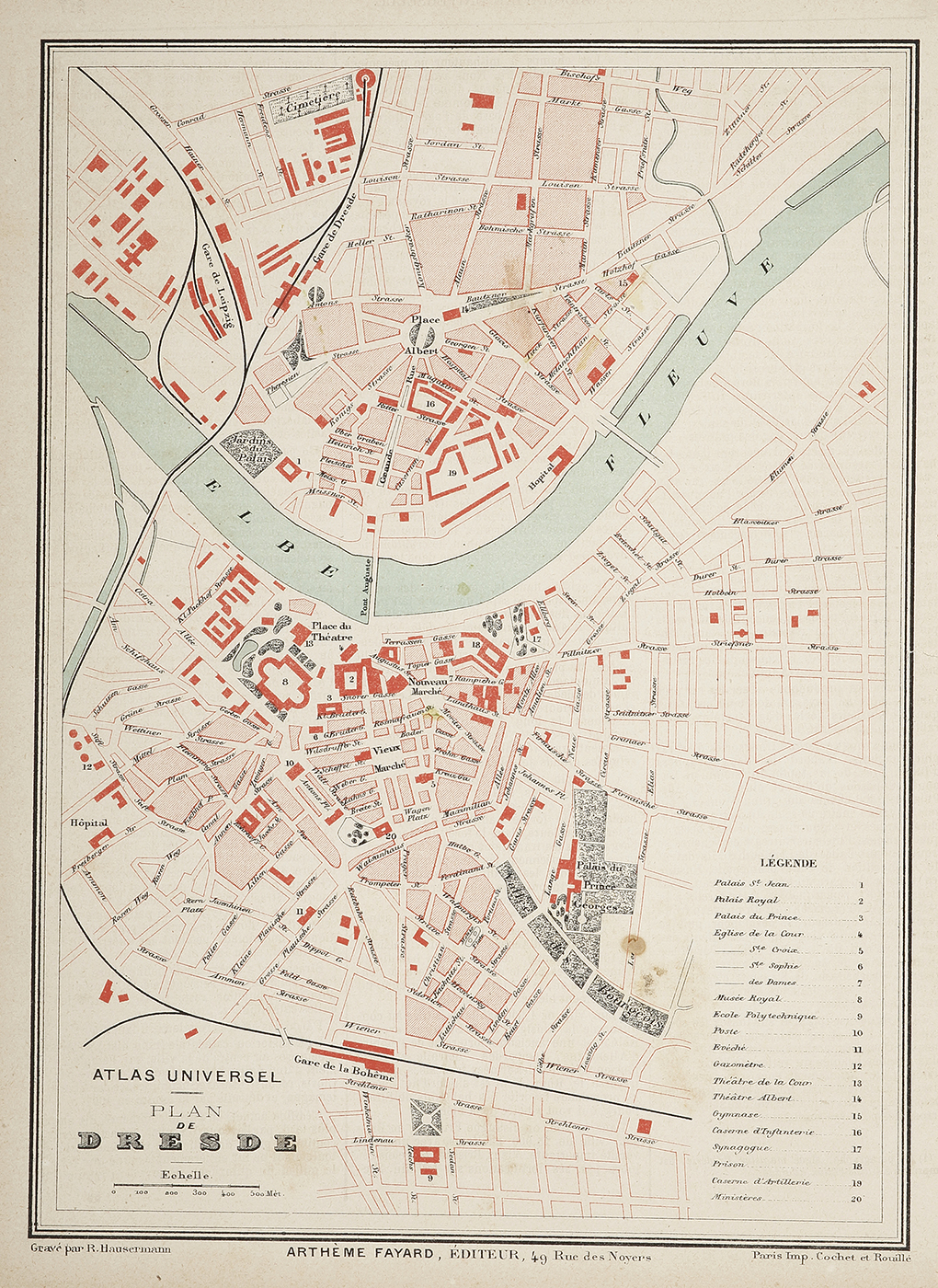 Detailed c.19th French plan of Dresden, Germany. From: Fayard, Artheme. Atlas Universel contenant la Gepographie…du Monde Collections: Bibliotheque Nationale de France: ark:/12148/bpt6k6569199