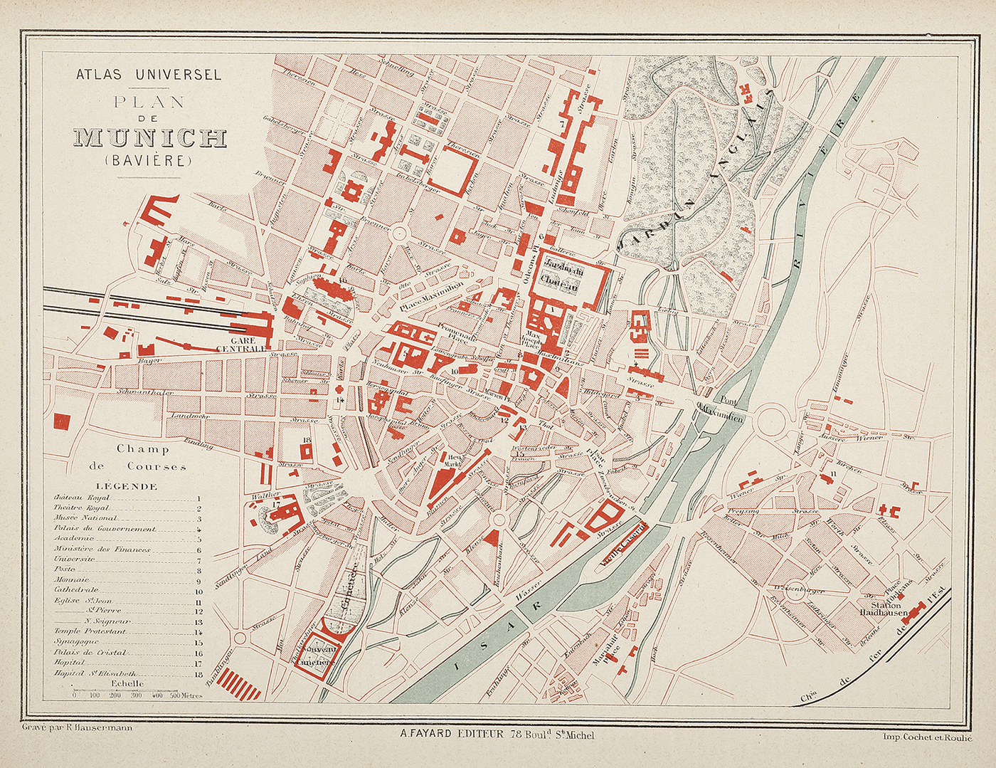 Detailed c.19th French plan of Munich, Germany with a key at lower left. From: Fayard, Artheme. Atlas Universel contenant la Gepographie…du Monde Collections: Bibliotheque Nationale de France: ark:/12148/bpt6k6569199
