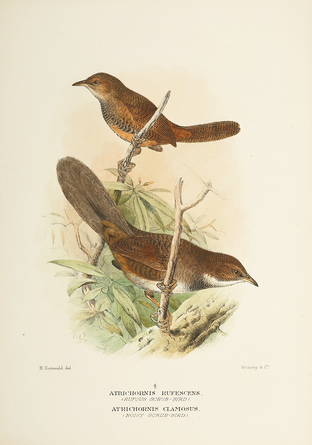 Atrichornis rufescens. (Rufous Scrub-bird). Atrichornis clamosus. (Noisy Scrub-bird).