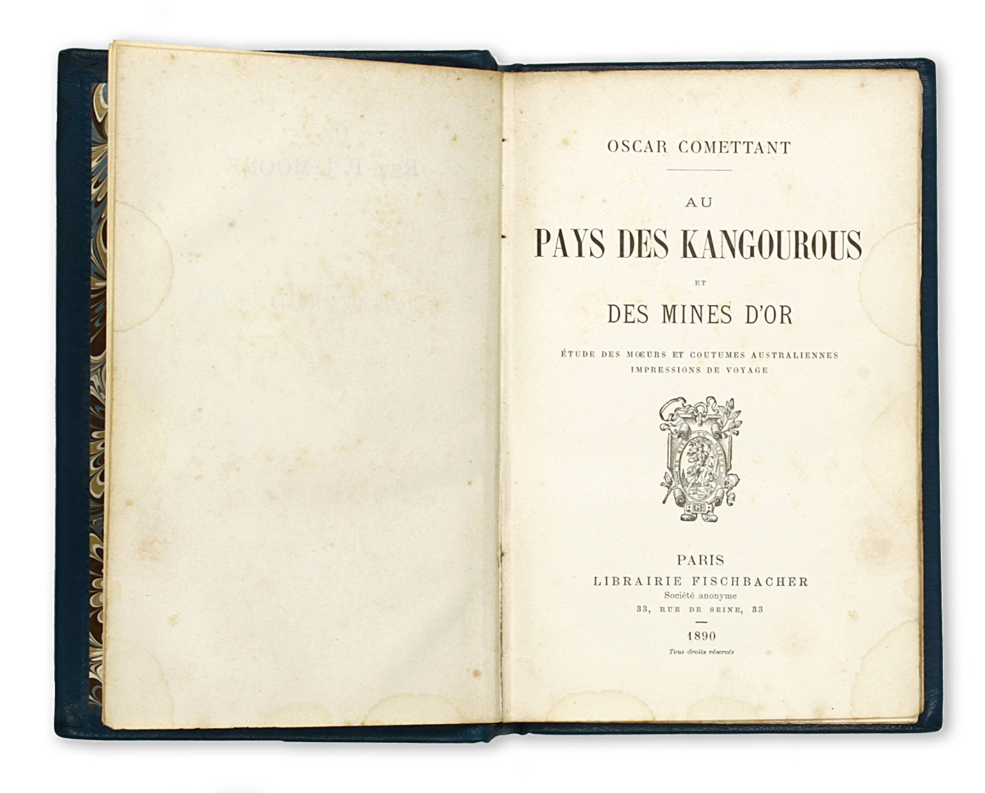 Oscar Comettant (1819-1898) account ‘In the land of the Kangaroos‘. Published Librairie Fischbacher, Paris. 4pp, 386pp, 6pp advertisements, Bound in modern full blue Morocco with raised bands, gilt lettering and marbled end papers. Blue ink owners stamp of, Rev. P.J. … Read Full Description