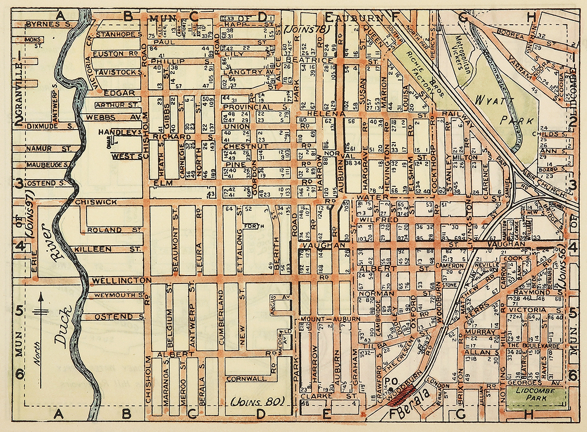 Scarce miniature c.20th hand coloured lithographed map of Auburn showing streets, tram lines, major thorough fares and Duck River.