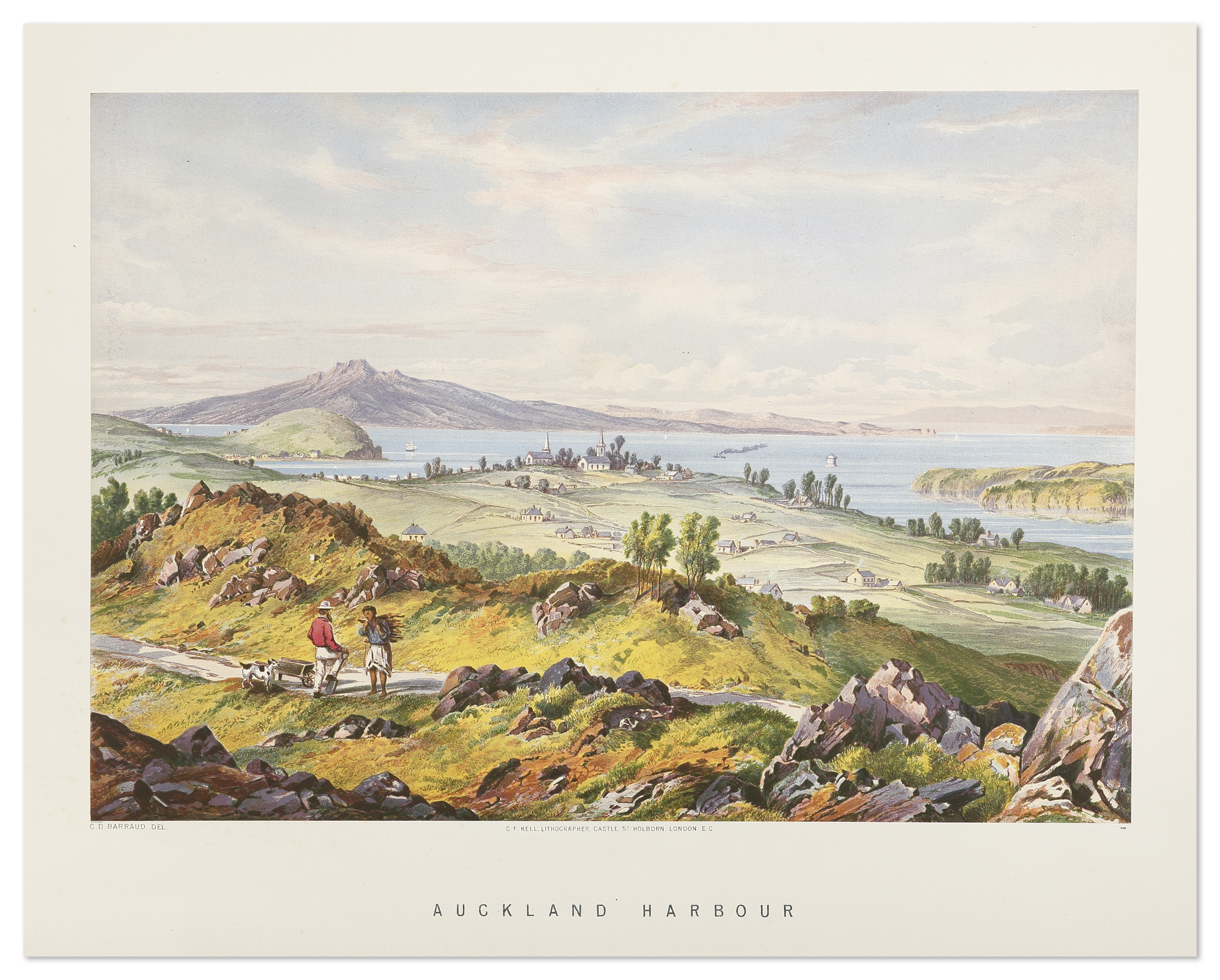 Large colour lithograph of Auckland in 1875, looking out to Auckland Harbour harbour by Charles Decimus Barraud.