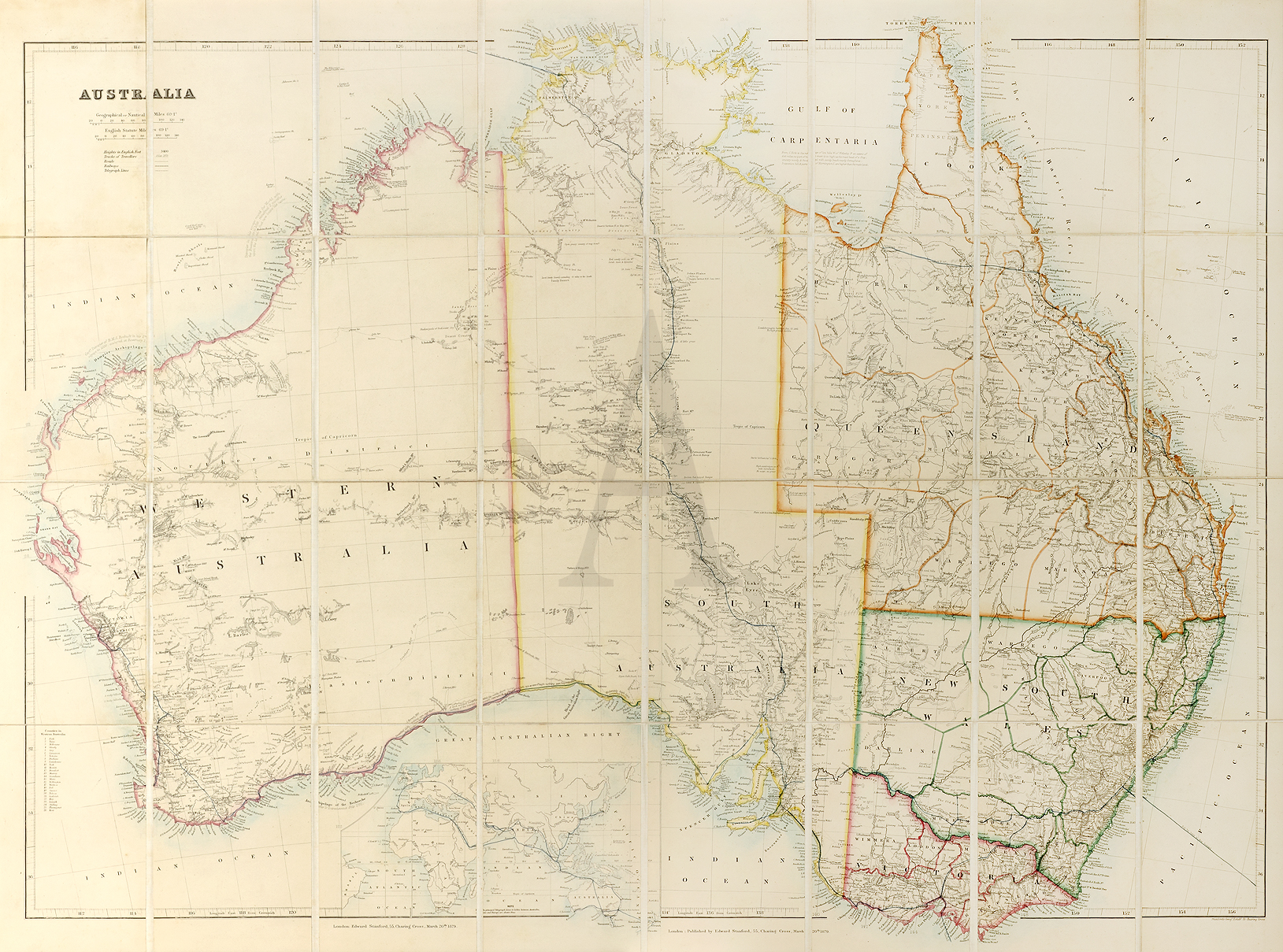 Large scale detailed map of Australia, laid on linen as issued. Explorers tracks are shown and inset of the world at lower sheet edge is included, with the tracks of an overland voyage in blue. Founder of one of the … Read Full Description
