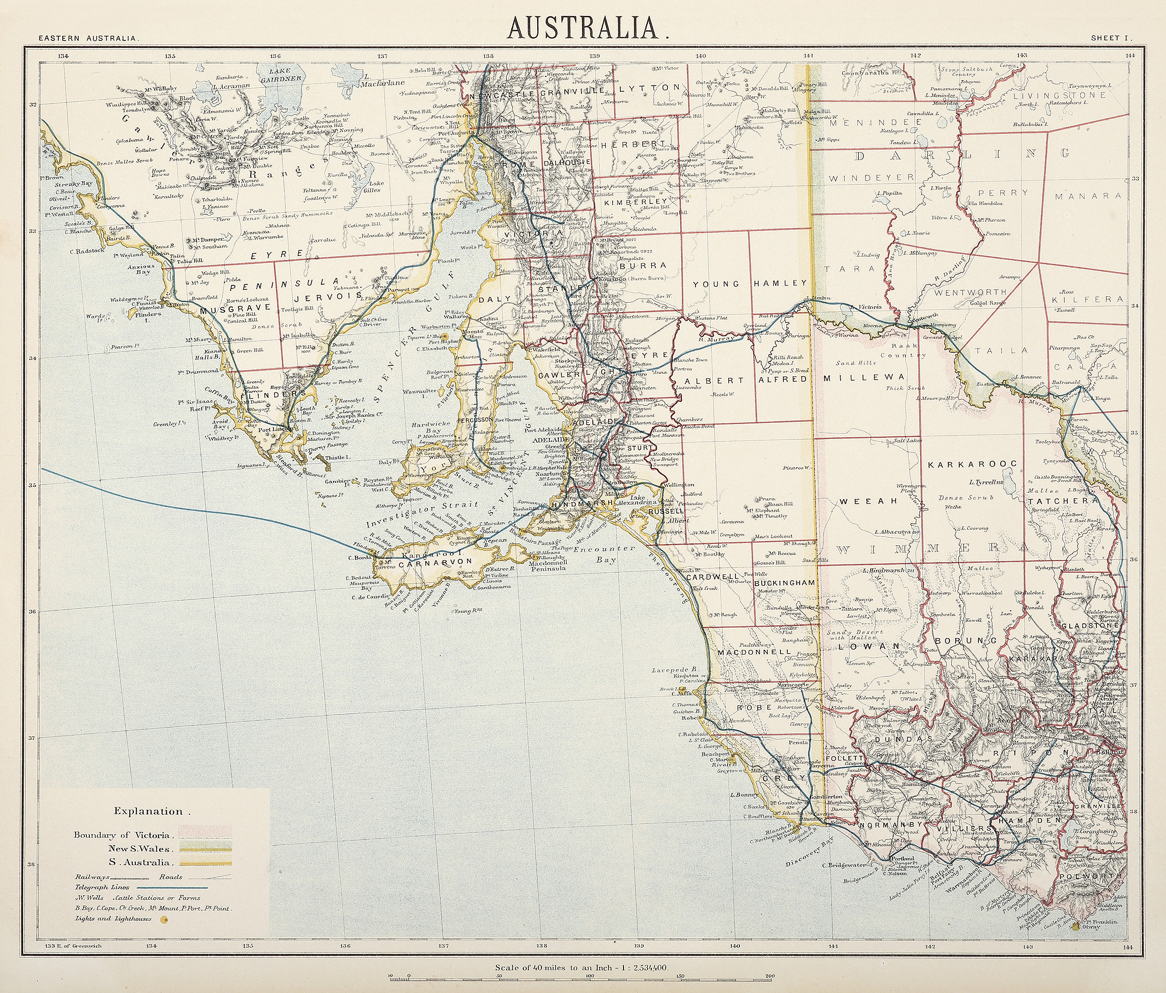 Scarce c.19th detailed hand coloured engraved map of South Australia and Victoria, extending from Streaky Bay, South Australia to Cape Otway, Victoria.