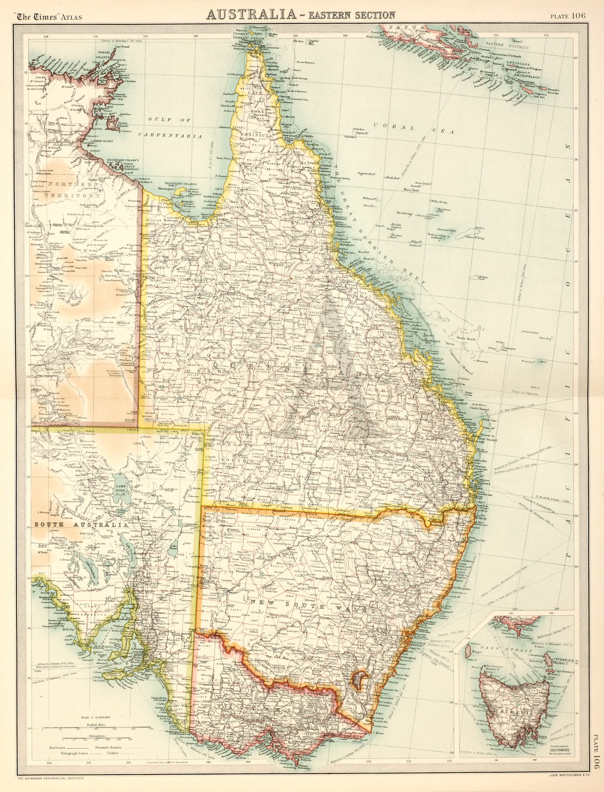 Detailed map of eastern Australia with inset of Tasmania. Included are counties, railways and the distances to various overseas destinations.