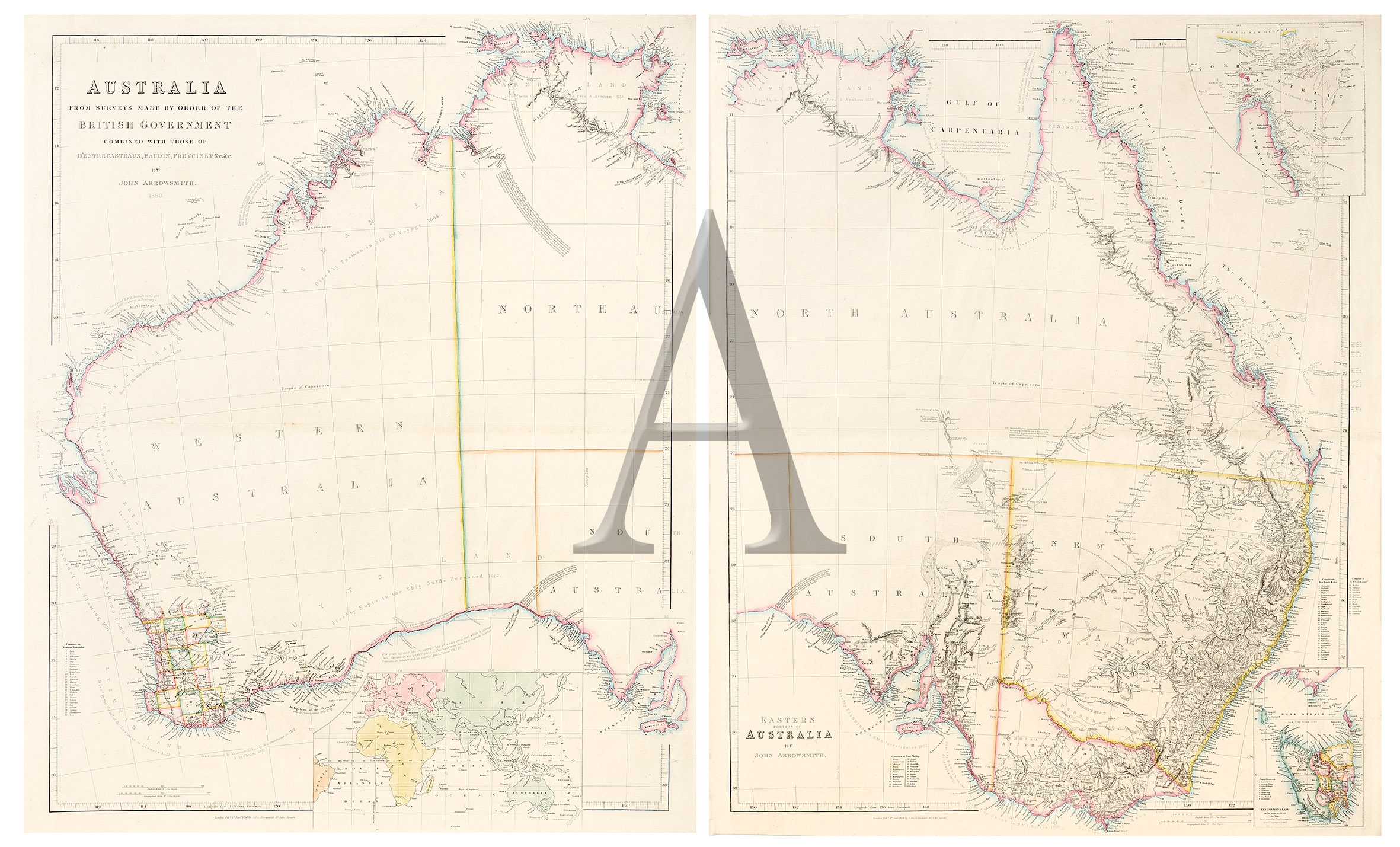 Arrowsmith’s important pair of maps of Australia on two sheets, recording the extent of settlement and the progress of inland exploration up to 1850.