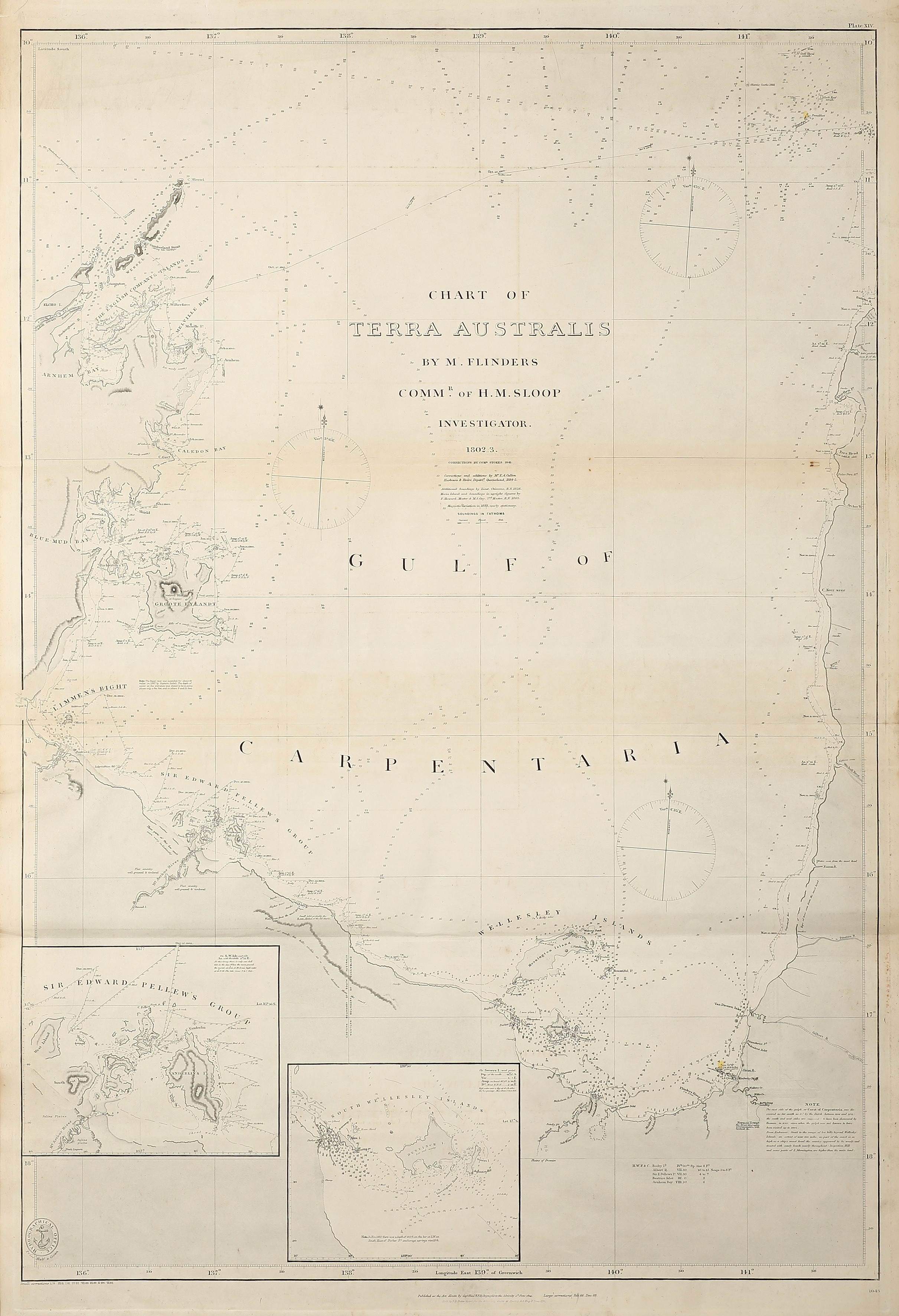 Scarce British Admiralty Hydrographic chart of the Gulf of Carpentaria by Matthew Flinders which was first issued in 1814.
