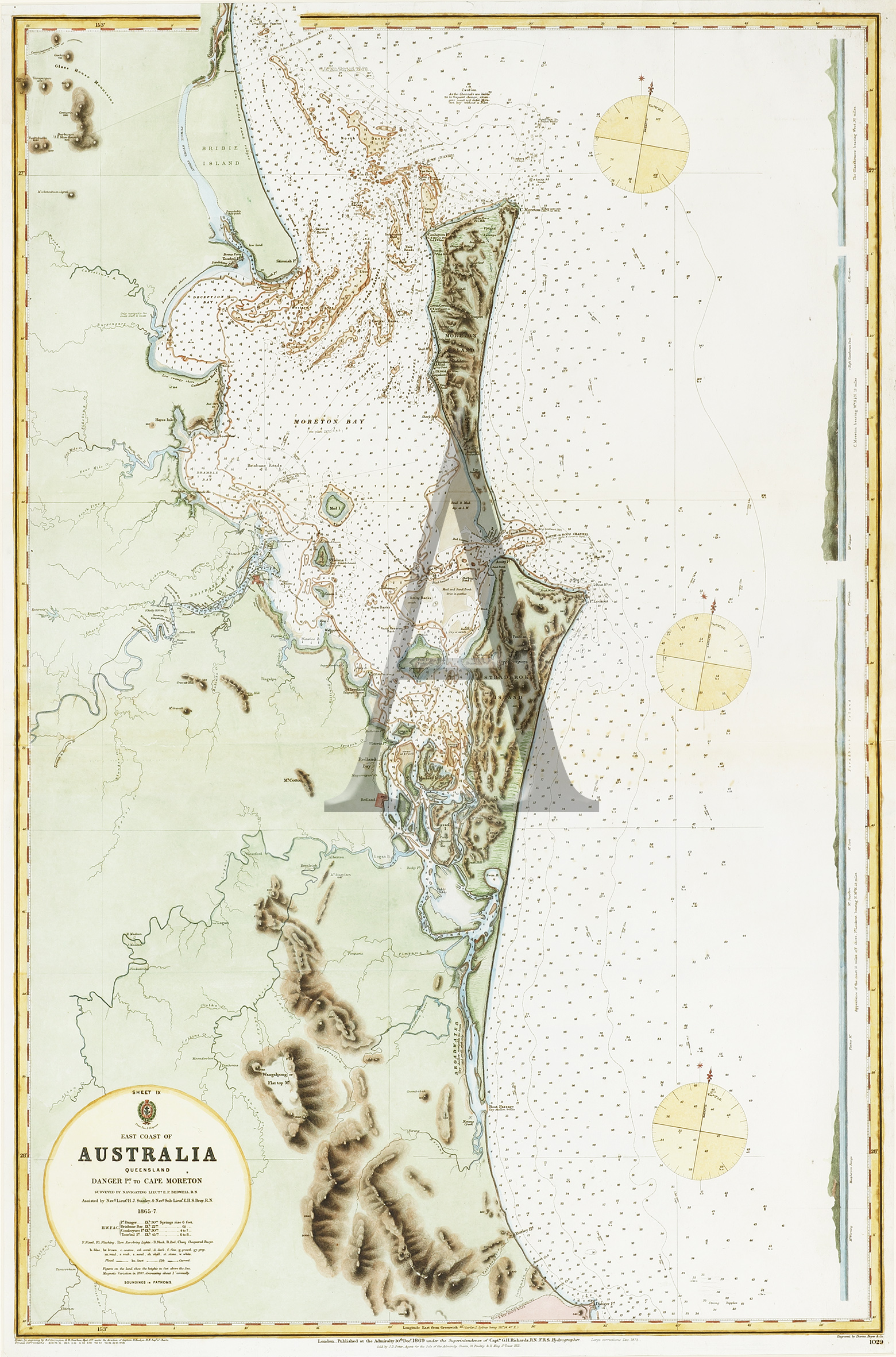 Important hydrographic map of the Queensland coast, extending from Moreton Bay to Danger Point (Coolangatta) from surveys conducted by E.P.Bedwell. First issued 1869 and here corrected to 1875 with small corrections to 1885. The regular updating of Hydrographic charts by … Read Full Description