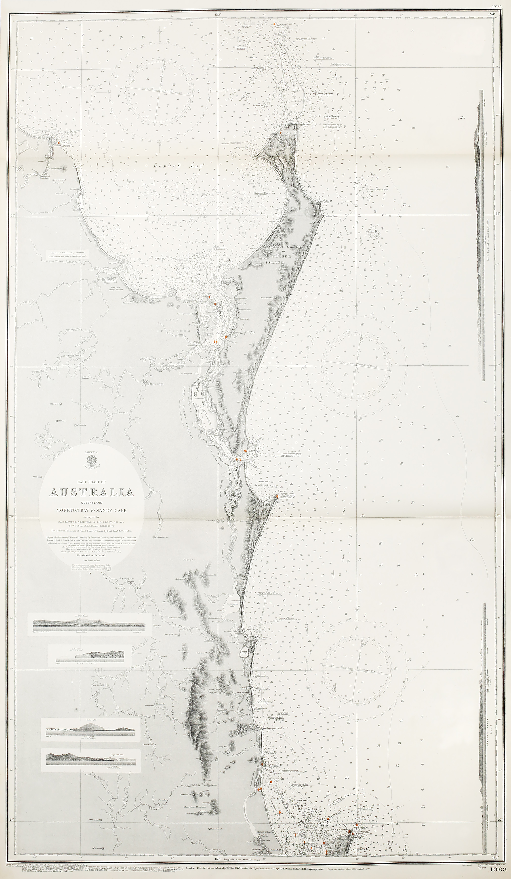Naval policy dictated that Admiralty charts be destroyed when superseded to avoid navigational error. It was during Rear Admiral John Washington’s period as the Admiralty’s hydrographer, 1855-1863, that a series of agreements were drawn up with the Australian colonies. These agreements provided boats and crews for use by officers lent from the Royal Navy to chart the coasts and shoal waters in the approaches to the rapidly developing towns, communication with which was seriously hampered by the the frequency of shipwrecks. It had been the discovery of gold and the consequent rush of miners and emigrants from not only England but California that added greatly the numbers of ships sailing to Australia’s east coast. This led to numerous petitions being made to Her Majesty’s Government to chart the eastern approaches to Australia to make for safer passage for shipping.