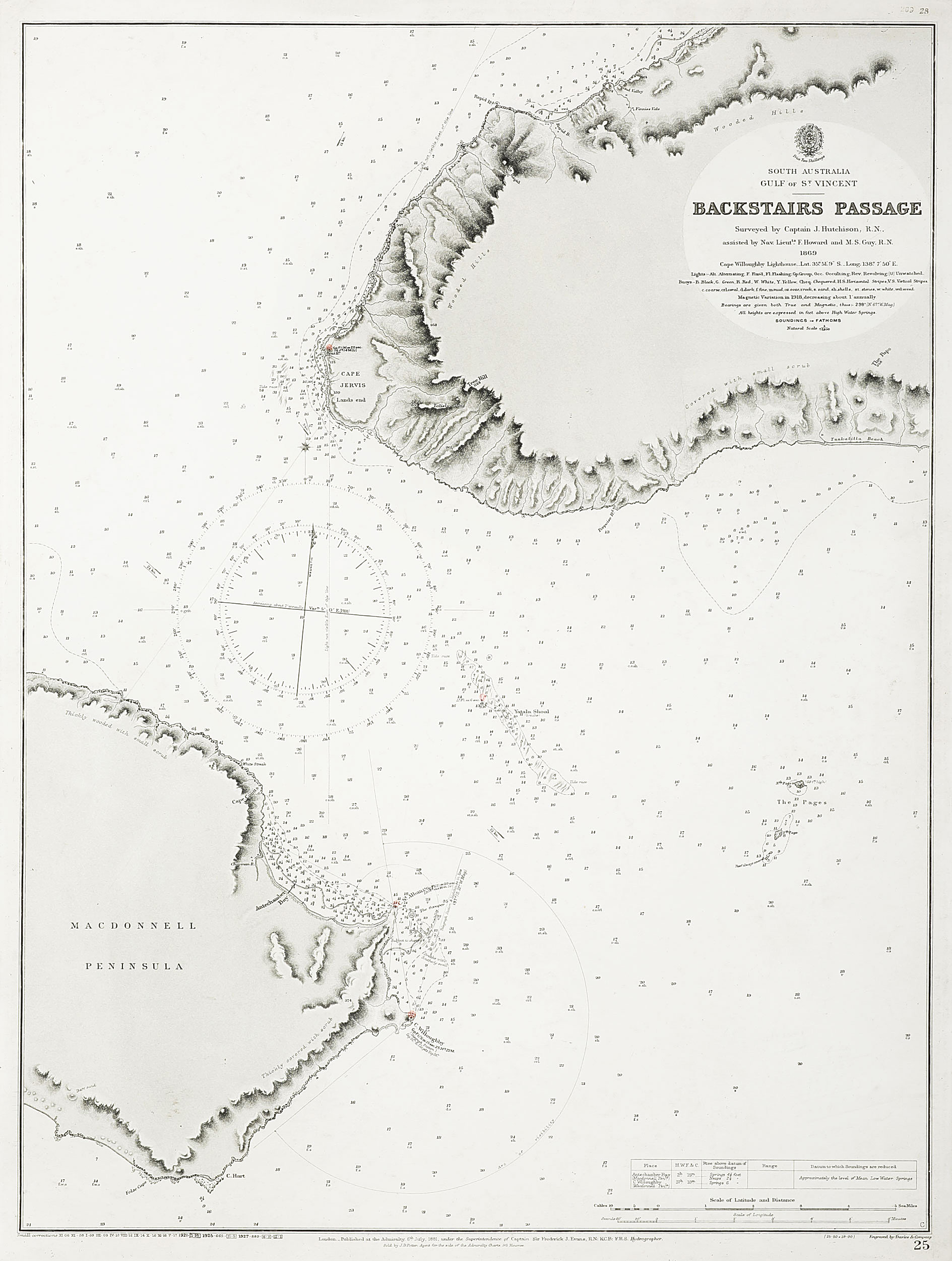 Scarce chart of Backstairs Passage, South Australia from the new Hydrographic survey first issued 6th July, 1881 . The chart extends from the eastern end of Kangaroo Island, Backstairs Passage and Fleurieu Peninsula and from Rapid Bay to Tunkalilla Beach by Captain J. Hutchinson, R.N., assisted by Nav. Lieuts. F. Howard and M.S. Guy, R.N. Without major corrections but with minor corrections to 1927.