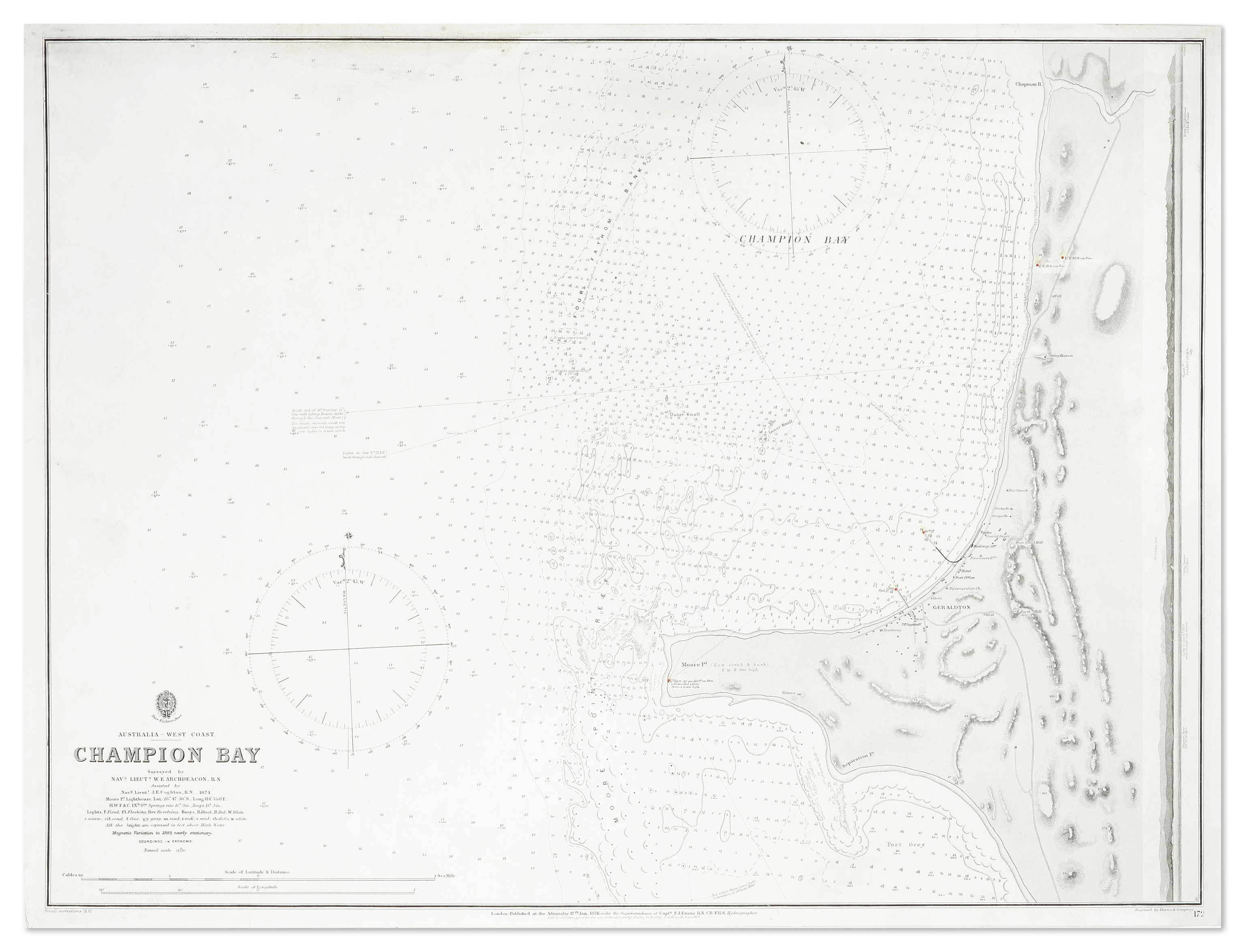 Rare admiralty chart of Geraldton’s, Champion Bay, Western Australia surveyed by Navg. Lieut. W.E. Archdeacon, R.N. Assisted by Navig. Lieut. J.E. Coghlan, R.N, first issued 17th January, 1876. This issue with small corrections in 1882.