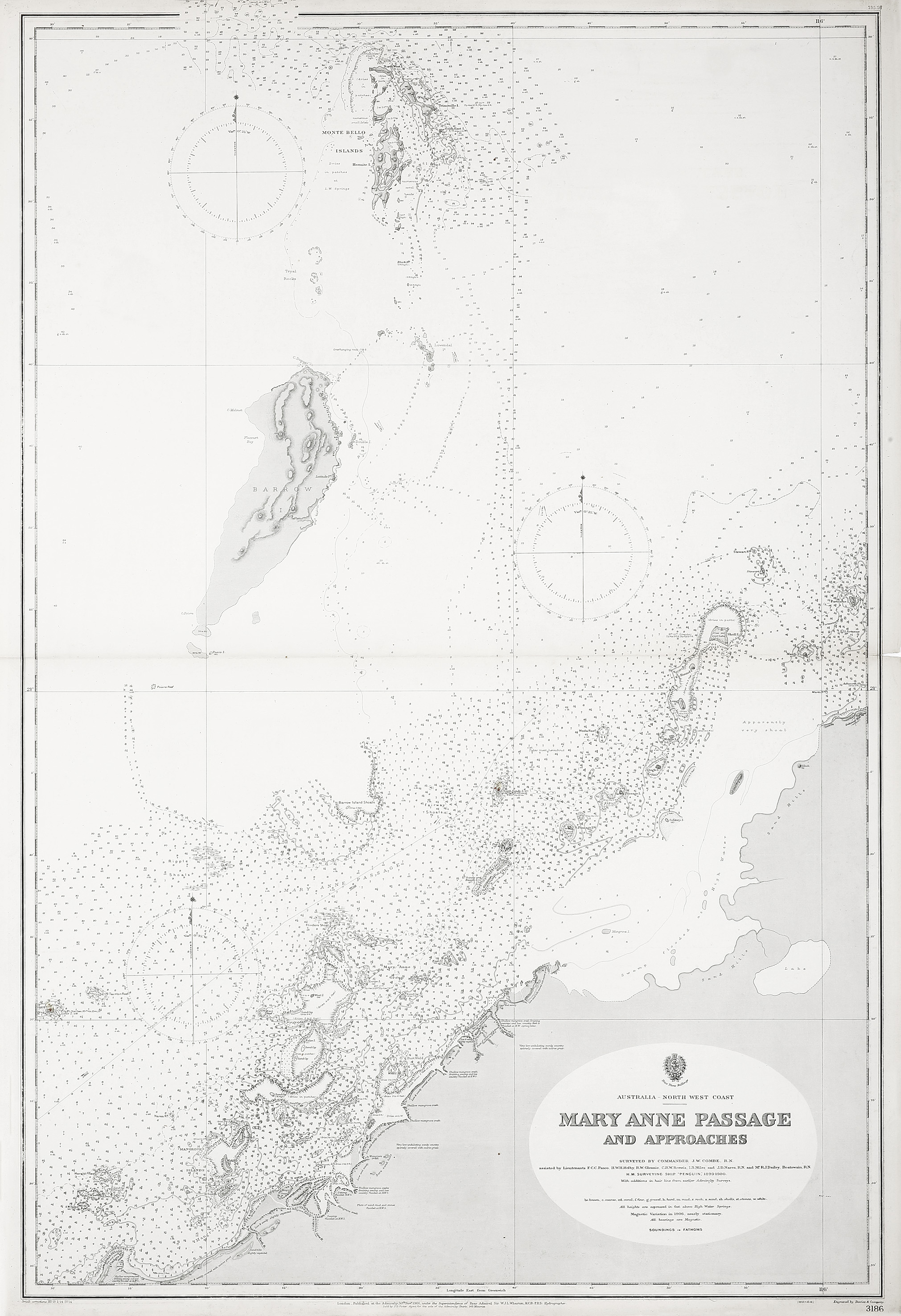 Rare large hydrographic chart of Mary Anne Passage on the north west coast of Western Australia, surveyed by Commander J.W. Combe. on H.M. Penguin, 1899-1900. First issued 30th November 1901 with small corrections to IV-1914.