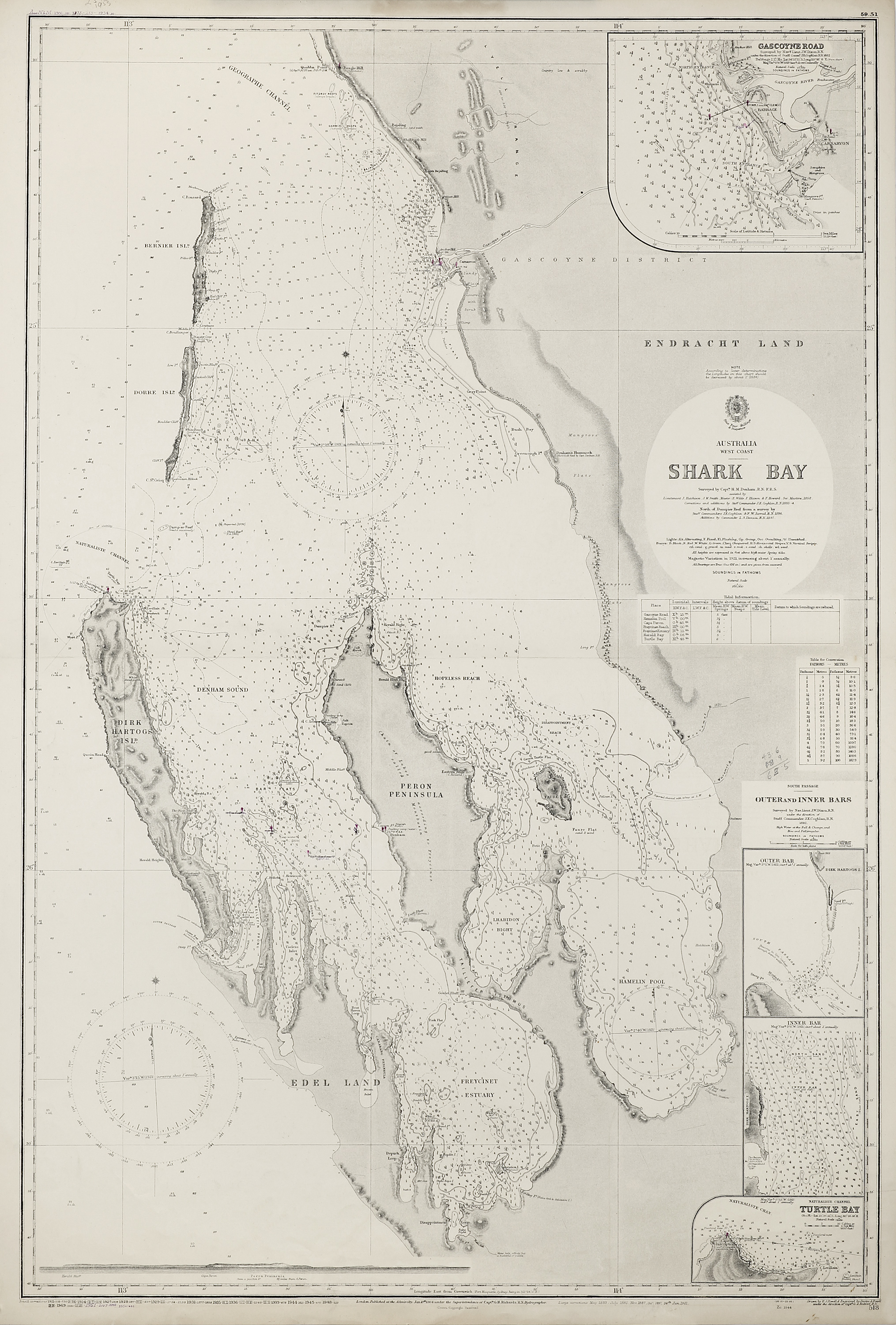 Scarce hydrographic chart of Shark Bay West Australia, based on the original surveys by Captain Henry Mangles Denham (1800-1887).