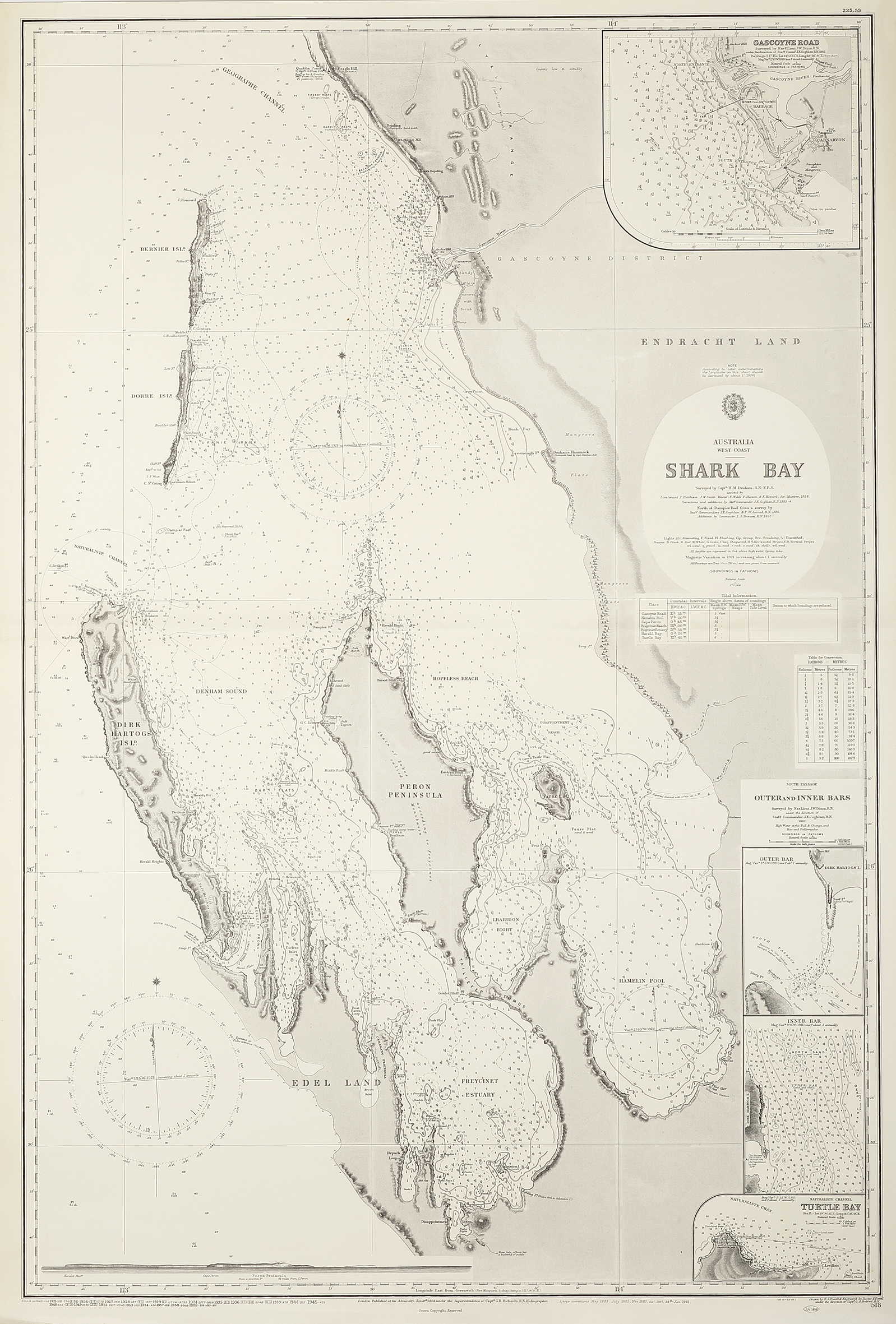 Scarce hydrographic chart of Shark Bay West Australia, based on the original surveys by Captain Henry Mangles Denham (1800-1887). This chart was first issued January 18th 1864, large corrections 24th January 1921 and small corrections 1959.