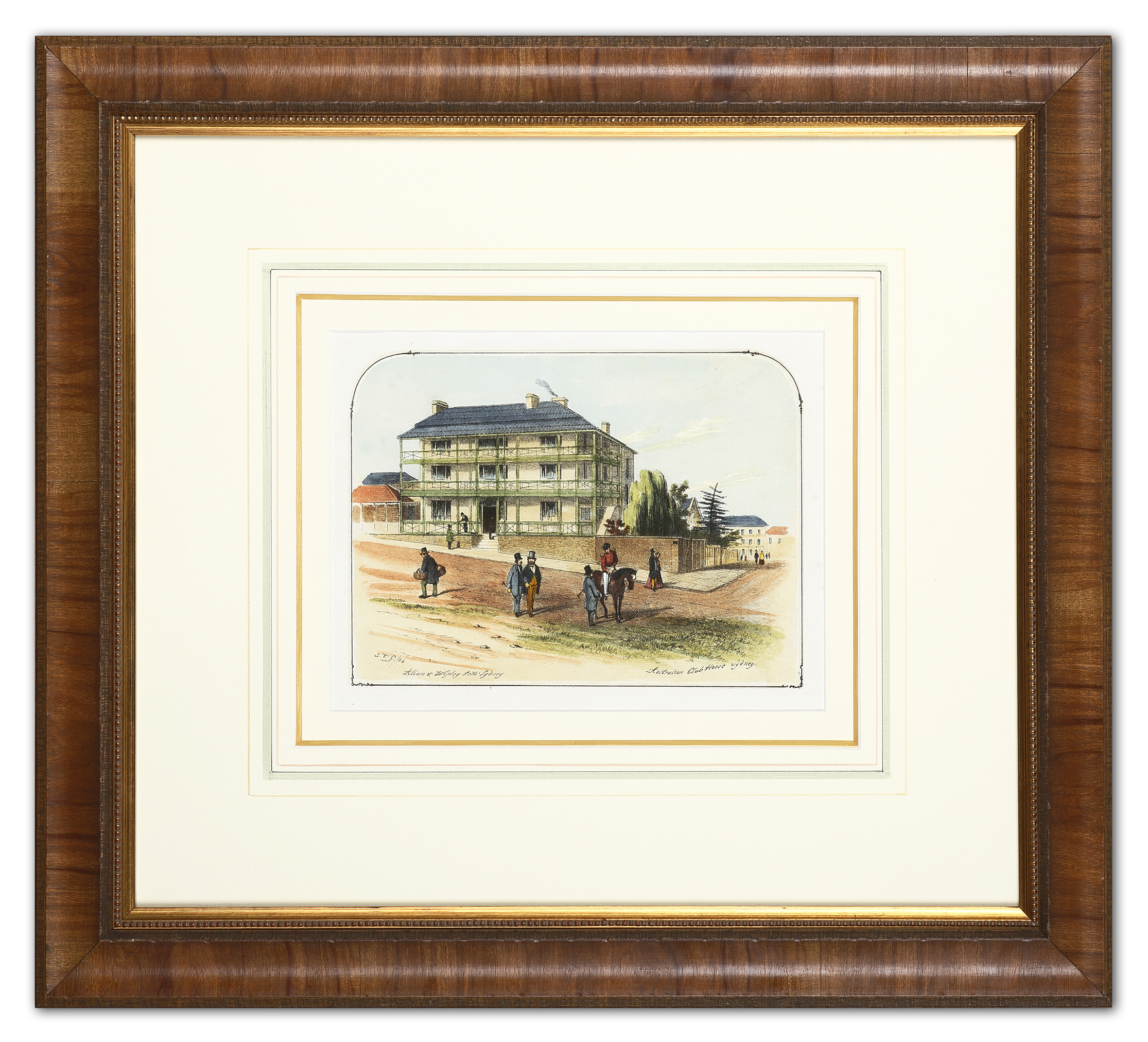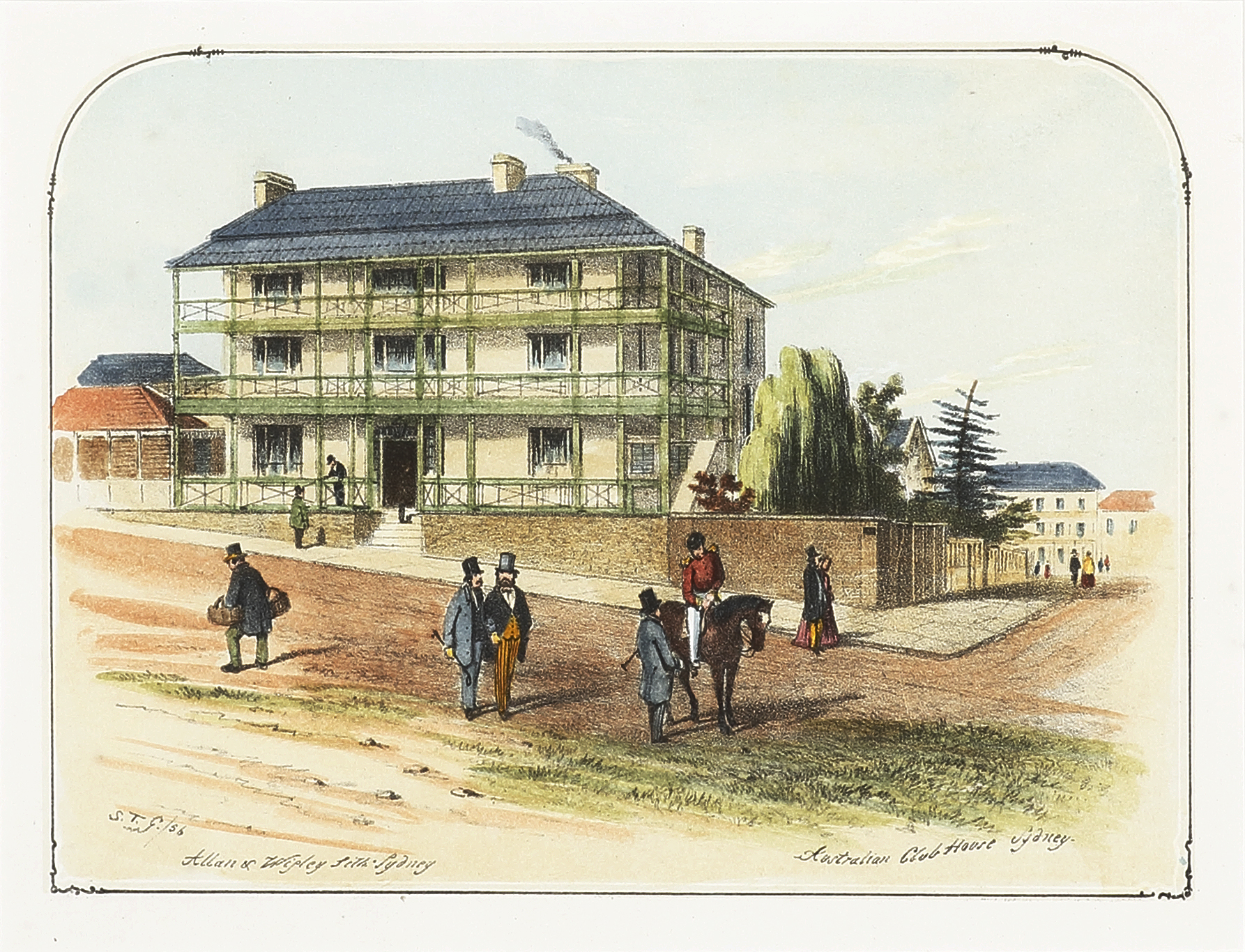 Rare view of The Australian Club which was founded in 1838 and located at 165 Macquarie Street, Sydney by Samuel Thomas Gill, who is best remembered for his depictions of colonial Australia. He moved to Sydney in 1856 and began publication of Scenery in and Around Sydney but the complete series was never completed and only two of the intended parts were ever issued.