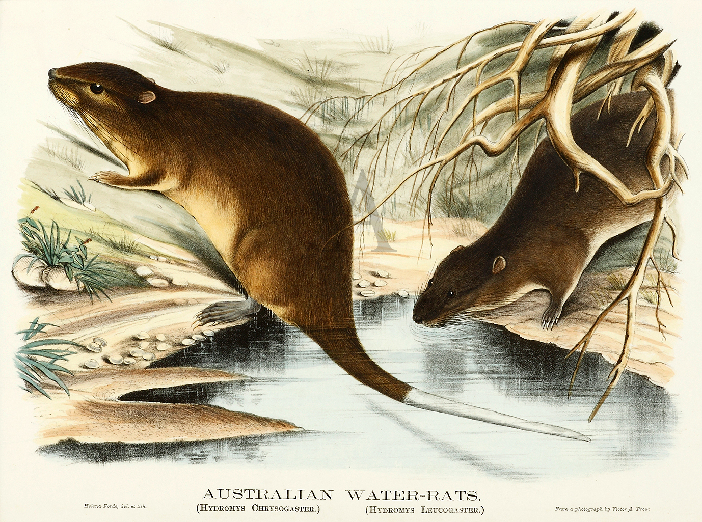 Scarce large c.19th hand coloured lithograph of the Australian water-rat by one of the few Australian colonial female artists, Helena Forde.