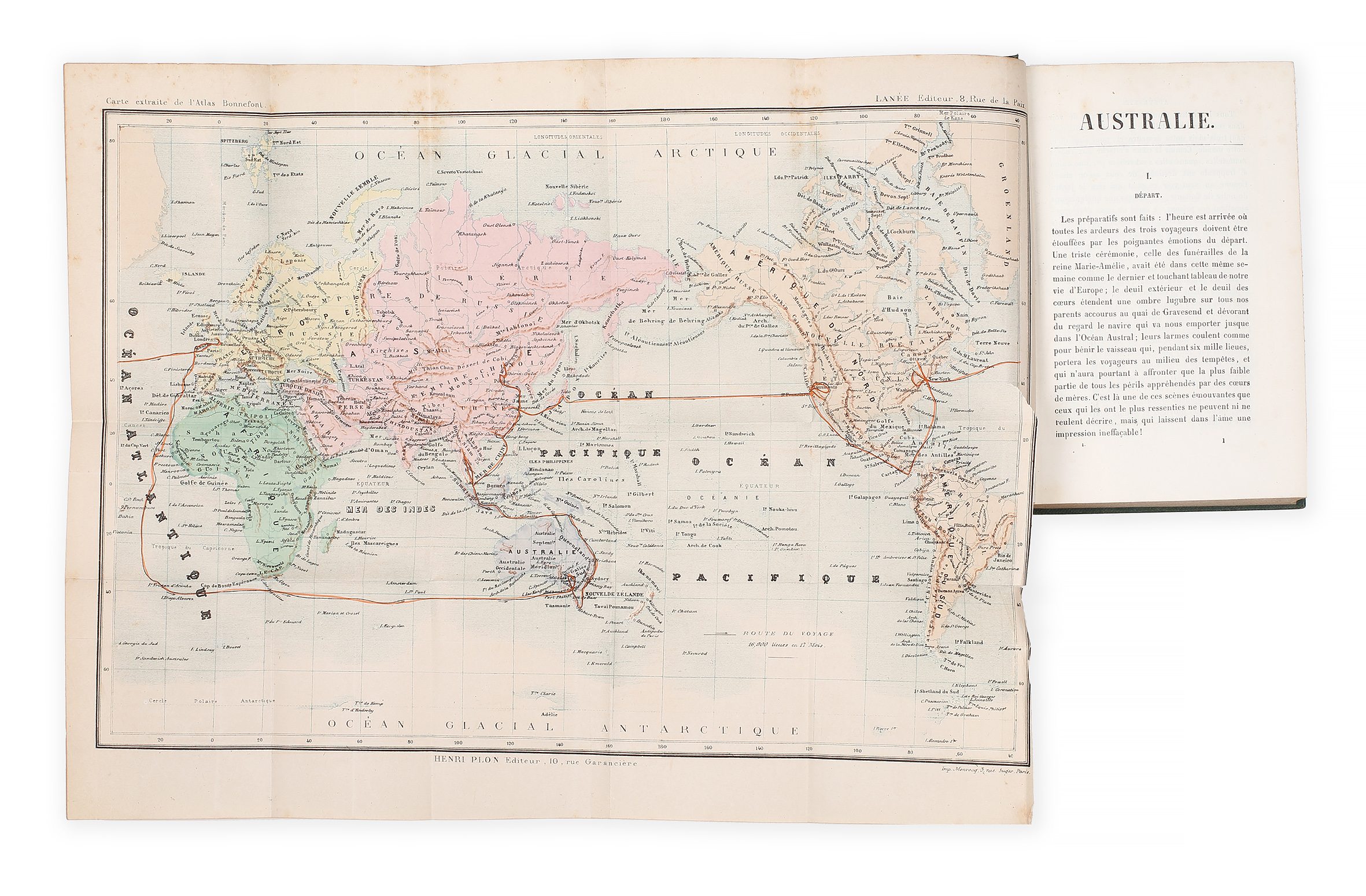 French c.19th account of travel throughout Australia. Fourth edition (1870), 12mo, Pp. iv, 364, two maps of the world and one of Australia, with 12 black white illustrations. Green embossed covers and raised bands with gilt title. References:Ferguson, J. A. … Read Full Description