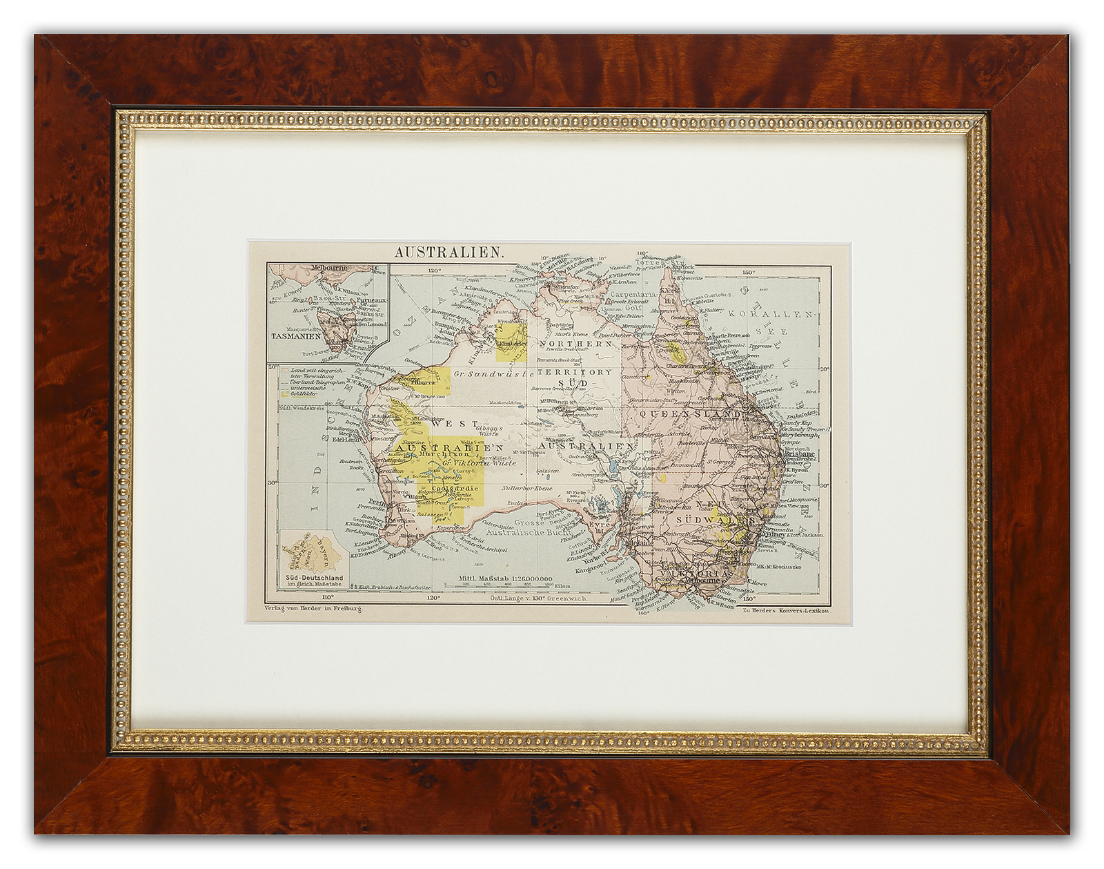 Small early c.20th map of Australia with insets of; Tasmania at top left and one of Southern Germany showing the relative size to Australia. Shows gold fields.