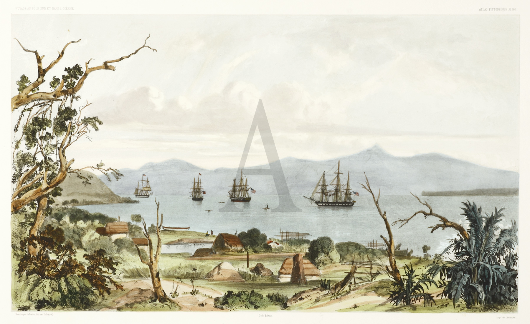 Superb lithograph of the two French ships, Astrolabe and Zelle, under the command of Dumont D’Urville in Akaroa.