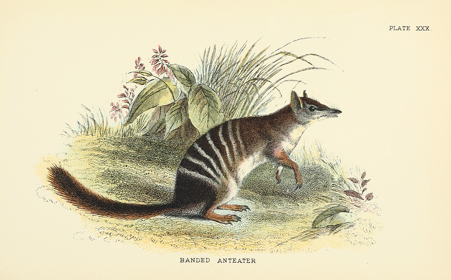 Scarce c.19th colour engraving of the Numbat. Modern scientific name: Myrmecobius fasciatus First described: Waterhouse, 1836 Distribution: WA Collections: National Library Australia: Bib ID: 973607 State Library New South Wales: Record Identifier 74VvbPRlbmWX State Library Victoria: Record ID 994424913607636 State … Read Full Description