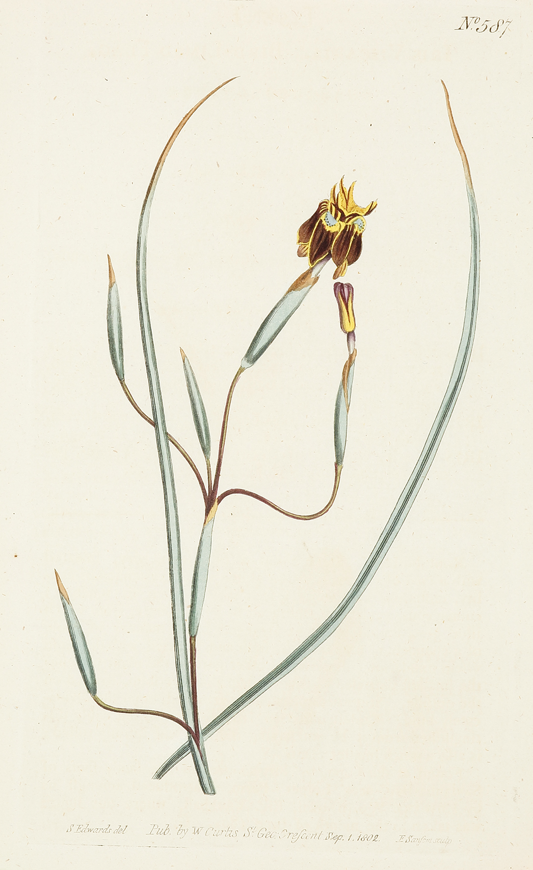 Fine original hand coloured botanical illustration of the Bird-Limed Flag Iris. From Curtis’s Botanical Magazine: or, Flower-Garden Displayed..