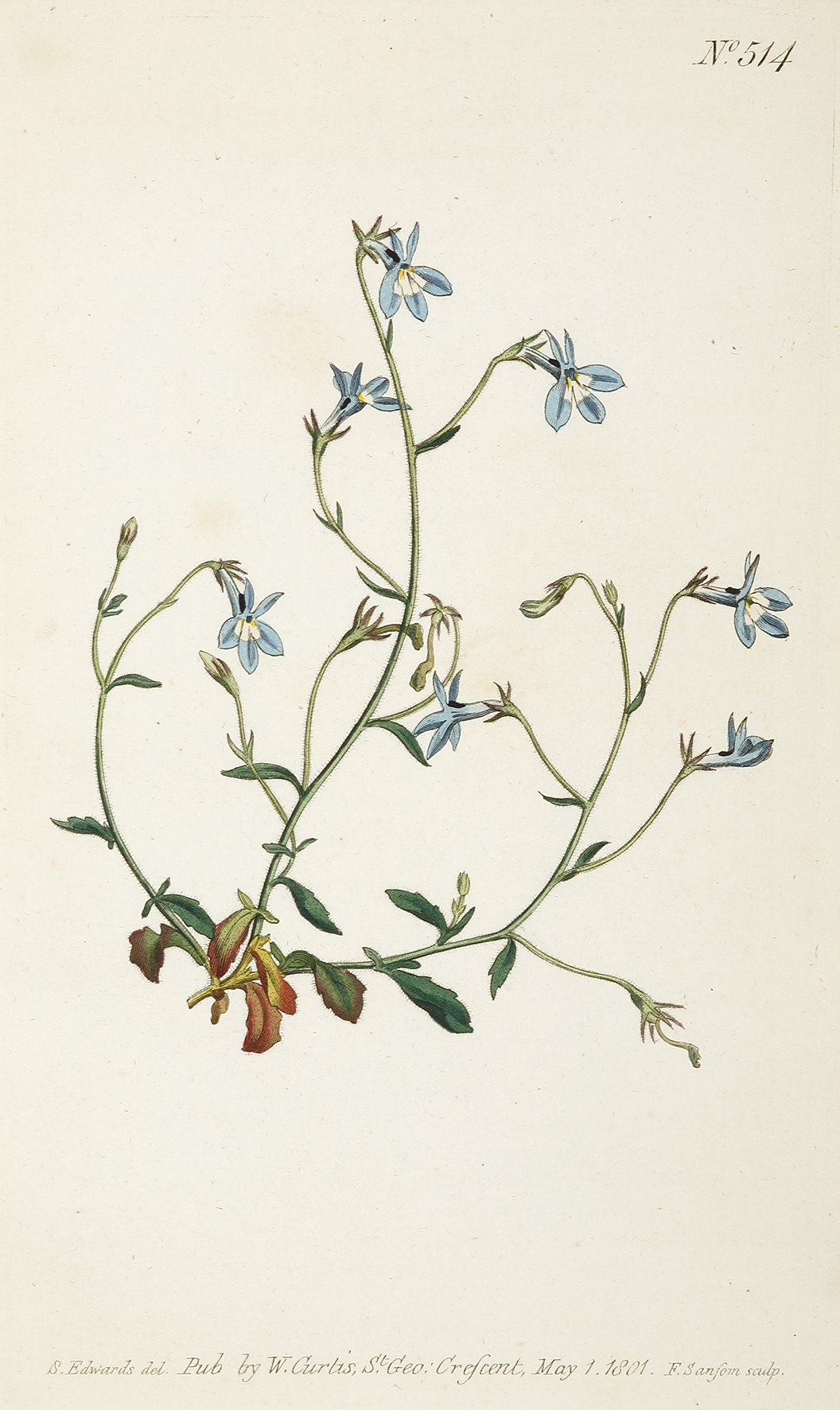Fine original hand coloured botanical illustration of the Lobelia which is native to southern Africa from Malawi and Namibia south to South Africa. Modern binomial name: Lobelia erinusCommon name: Lobelia From Curtis’s Botanical Magazine: or, Flower-Garden Displayed.