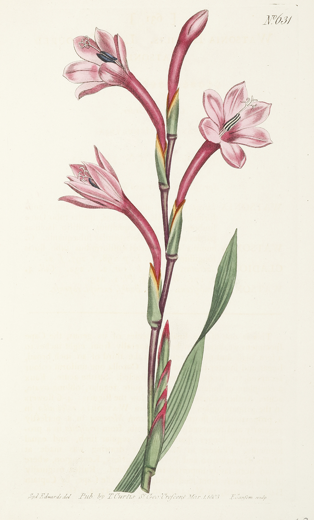 Fine original hand coloured botanical illustration of the Lake-coloured Watsonia or Bugle Lily plant from Curtis’s Botanical Magazine: or, Flower-Garden Displayed.