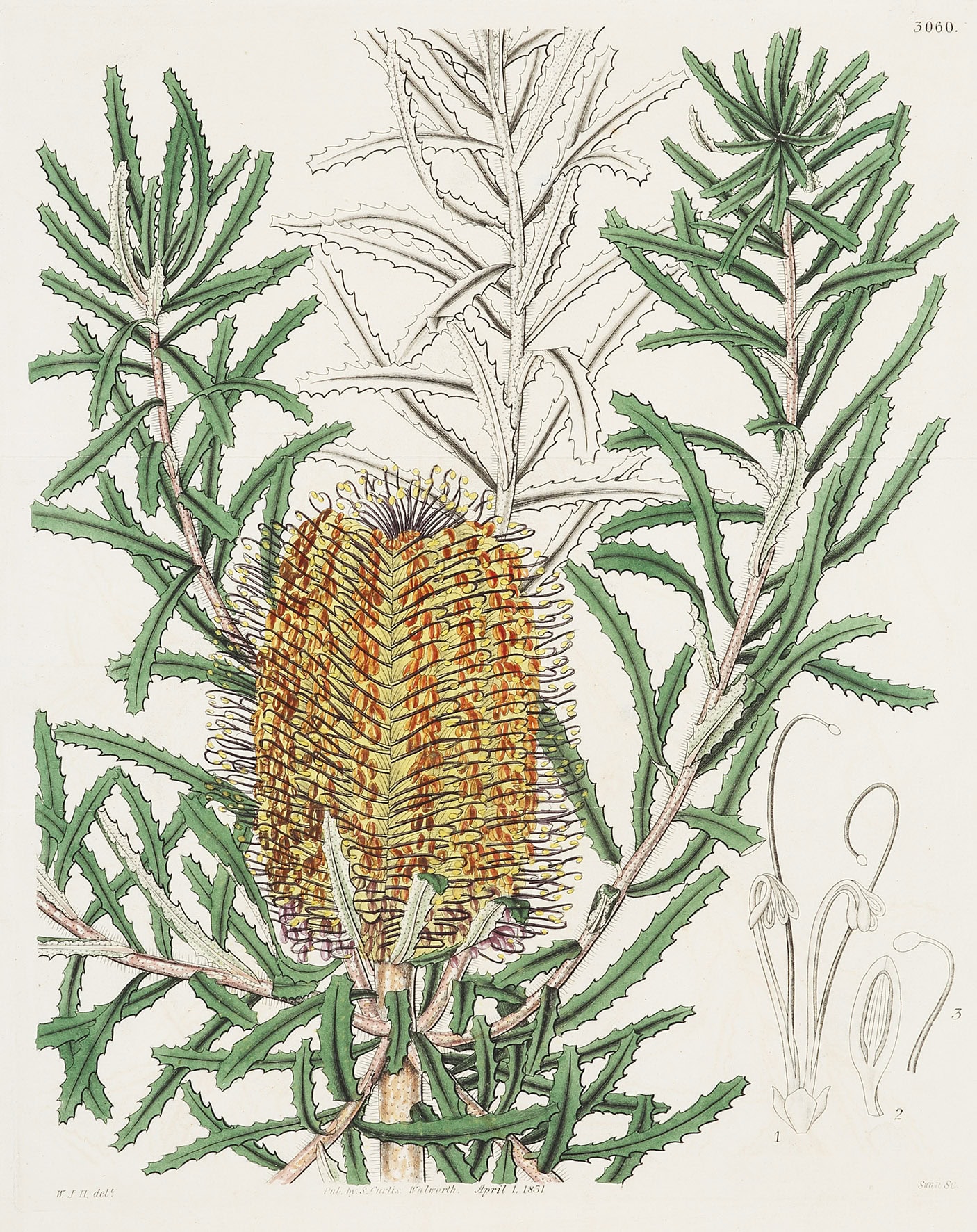 Rare c.19th hand coloured engraving of the Swamp banksia by J.W. Hooker by one of the most famous of all English botanical artists.