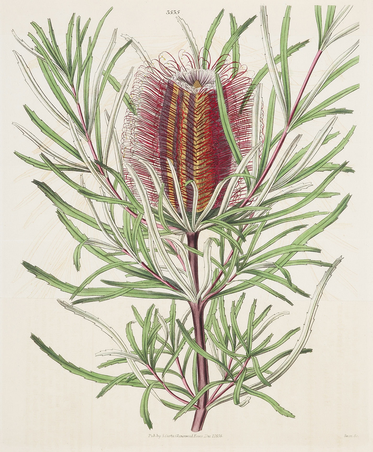Rare c.19th hand coloured engraving of the Red swamp banksia.