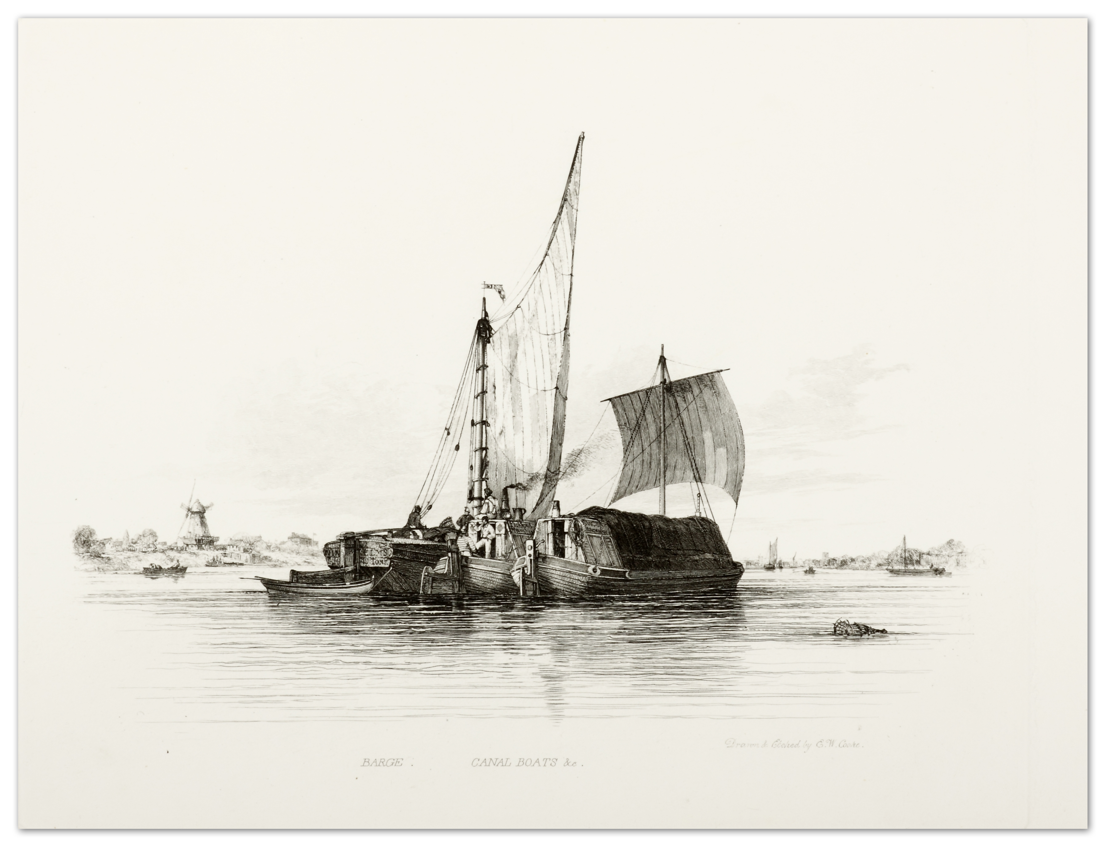 A barge is a flat-bottomed boat, built mainly for river and canal transport of heavy goods. A fine etching by Edward William Cooke (1811-1880) from, Fifty plates of shipping and craftt which he drew and etched all the images. Cooke … Read Full Description