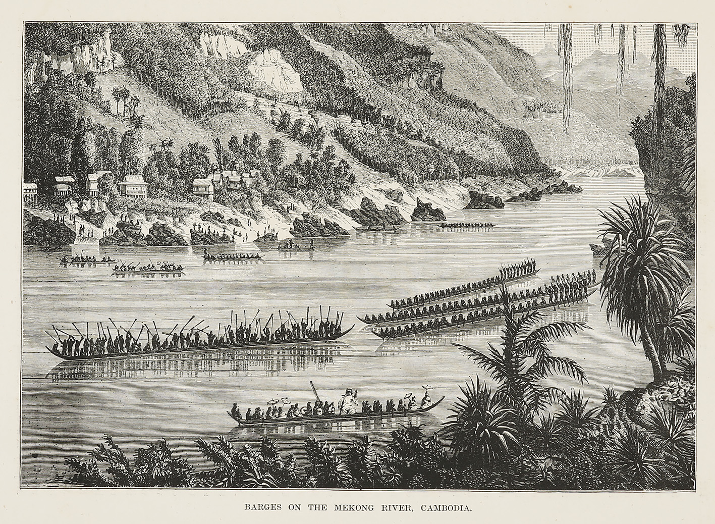 Scarce c.19th engraved view of barges on the Mekong River, Cambodia.
