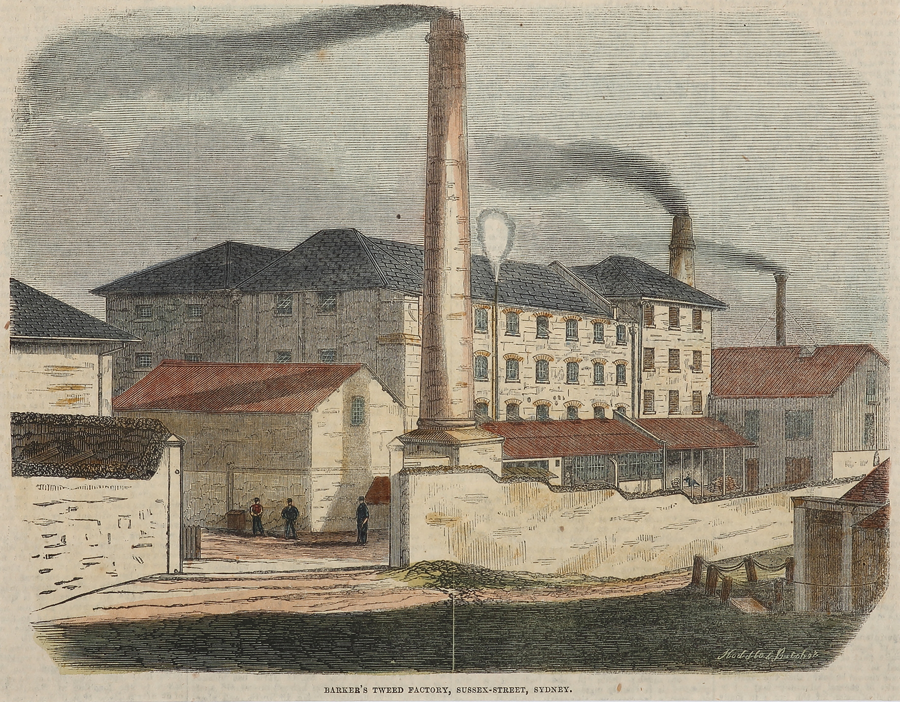 Rare c.19th hand coloured engraving of Barker’s tweed factory, Sussex Street, Sydney.