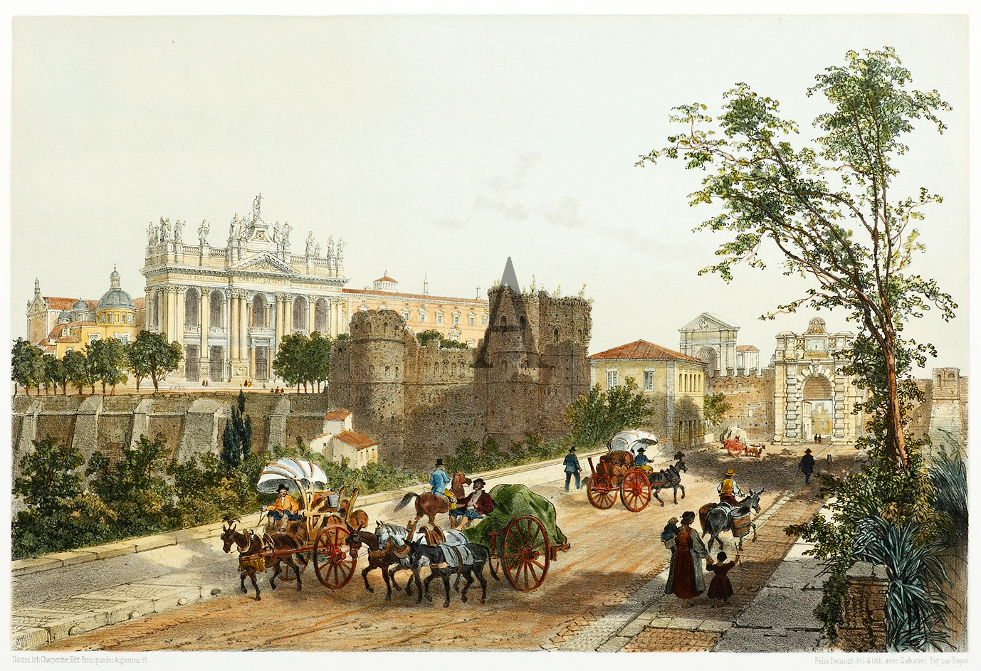 Rare folio lithograph of the Basilica di san Giovanni-In-Laterano, the cathedral church of the Diocese of Rome and the official ecclesiastical seat of the Bishop of Rome, who is the Pope. To the right of the image is the new access, “la porta moderna de San Giovanni” on Piazzale Appio.