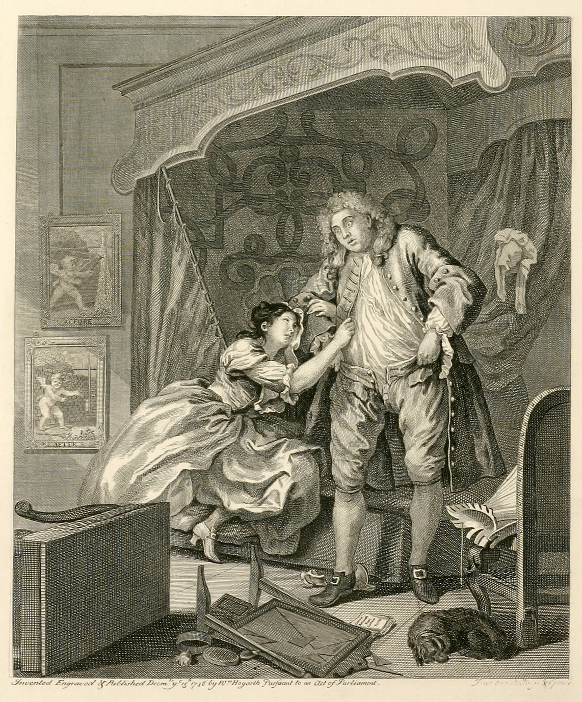Hogarth was born in London, the son of an unsuccessful schoolmaster and writer from Westmoreland. After apprenticeship to a goldsmith, he began to produce his own engraved designs from 1710. He later took up oil painting, starting with small portrait groups called conversation pieces. He went on to create a series of paintings satirising contemporary customs, but based on earlier Italian prints, of which the first was ‘The Harlot’s Progress’ (1731), and perhaps the most famous ‘The Rake’s Progress’. His engravings were so plagiarised that he lobbied for the Copyright Act of 1735 as protection for writers and artists.