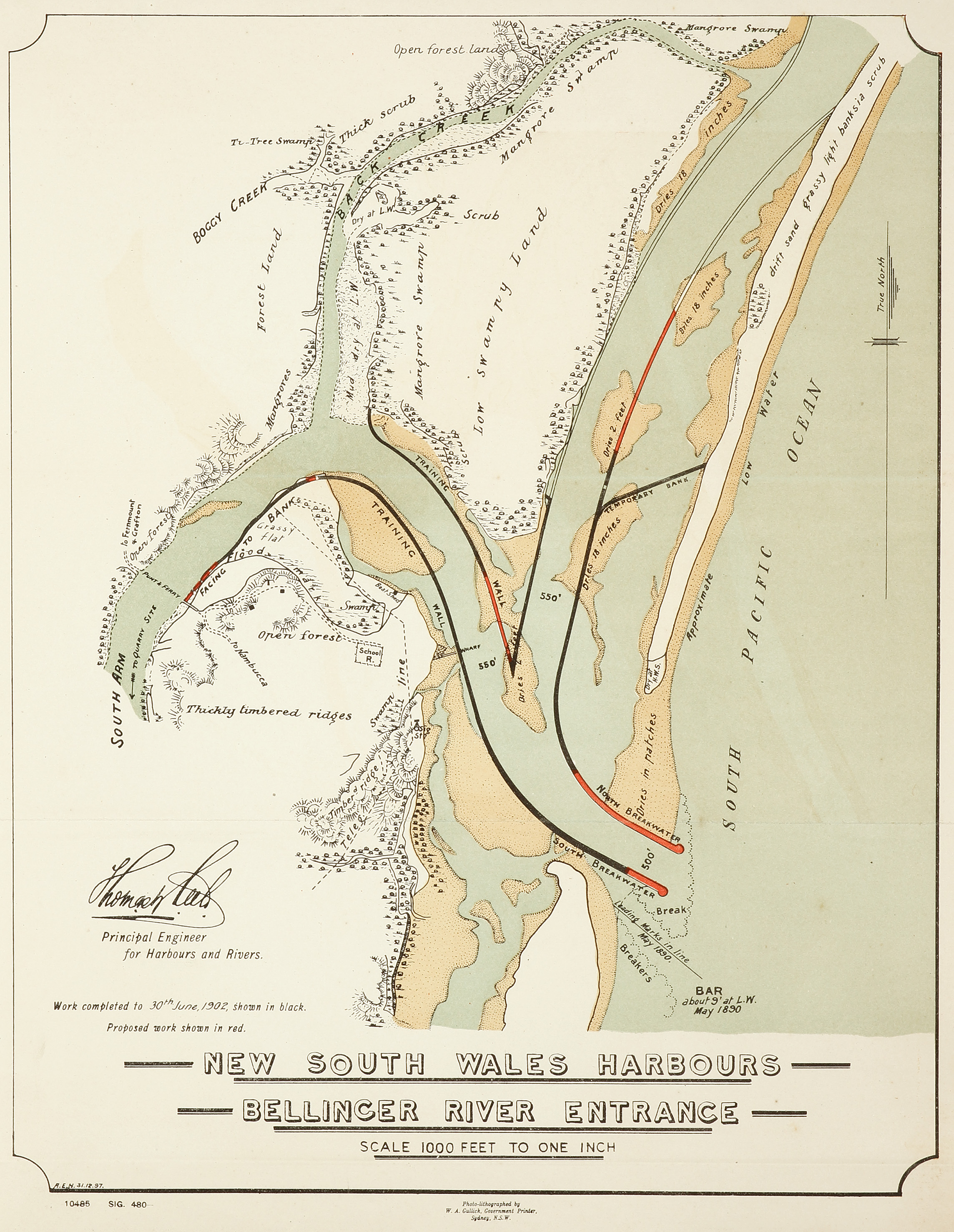 Rare detailed map of present day Uranga, Yellow Rock Island and the mouth of the Bellinger River, from the surveys by McKenny, showing depths and mud flats which are coloured brown. Allotments in the town have owners names marked. Showing improvement works headed by Thomas William Keele, the Principal Engineer of the Harbours and Rivers Branch.