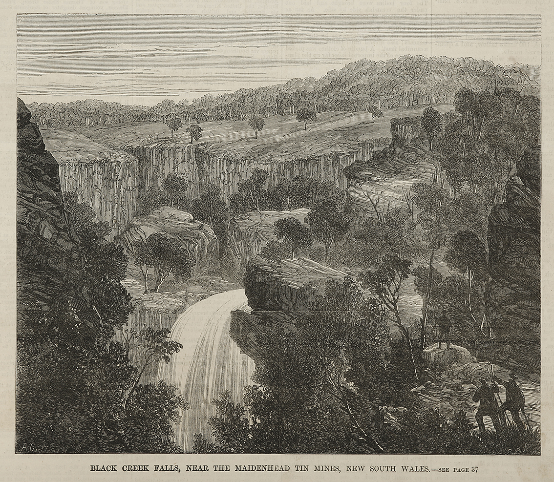 Scarce engraving of Maidenhead tin minas at Black Springs, NSW, view of the Falls. Collections: State Library Victoria: IAN27/03/73/45