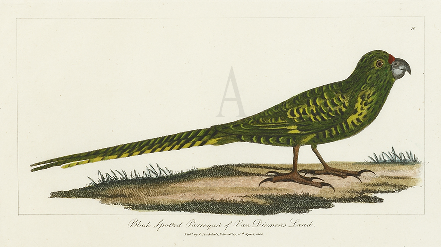 Early image of this endangered Australlian parrot. From the first English edition of the account by Jacques Julien Houton de Labillardi�re 1755-1834 who searched for la P�rouse’s vanished which was last seen at Botany Bay in January 1788.