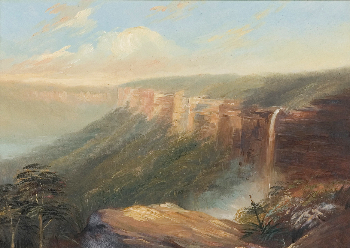 View of Govett’s Leap. Studies Melb. (with van den Houten) Sydney (with Knut Bull). A member of the Art Society of NSW, 1883. References McCulloch, Encyclopedia of Australian 2006. Page 413 Campbell, Australian Watercolour Painters: 1780 to the Present Day. Page 308 Represented NLA, SLNSW, QVMAG JITGLY