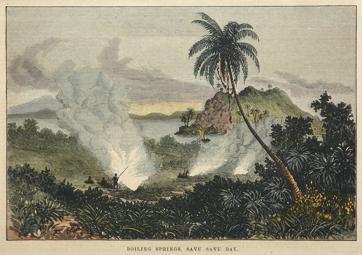 Scarce c.19th hand coloured engraving of Savusavu, Fiji. From the original edition of the Australasian Sketcher. Collections: National Library Australia: Bib ID 914558 State Library New South Wales: REF1/MAV/FM4/9236-9239 State Library Victoria: PCINF AS 06-09-73 P.104
