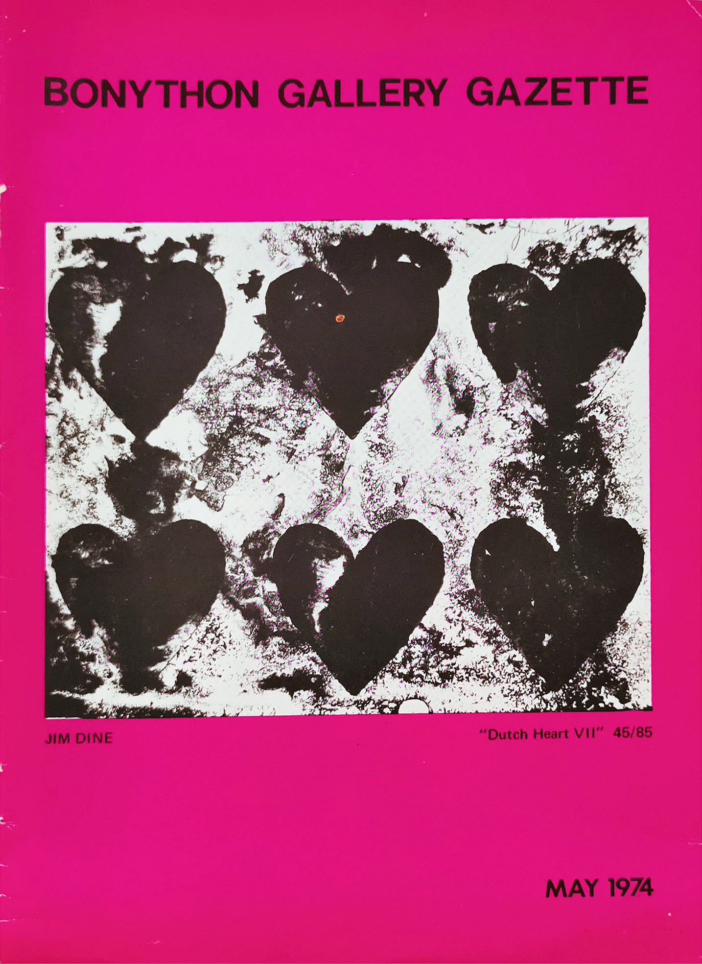 Bonython Gallery Gazette for May 1974 of upcoming exhibitions by Jacqueline Hick, Robert Bell, Helen Geier, David Rose, John Winch, John Hansen and “50 years of the National Art School”. Each of the artists has a biography included. Soft bound with magenta cover, 8pp.