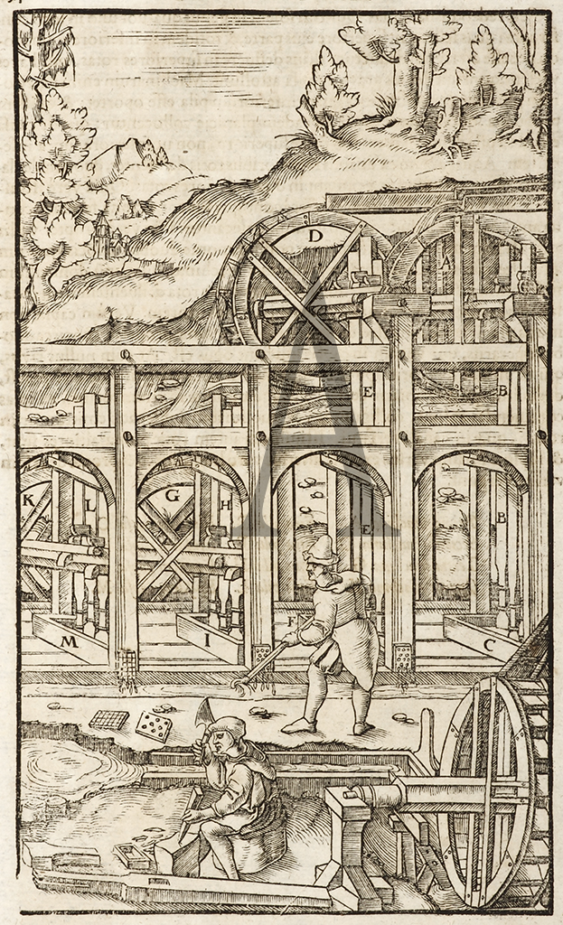 Rare woodcut from De Re Metallica printed in 1560, which was the the most famous study on all aspects of mining and metallurgy, and one of the first technological books of modern times. But to return to the stamping machines. … Read Full Description