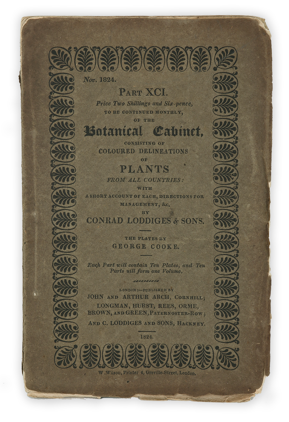 This separately issued part numbered XCI (91) was issued on November 1824, contains ten plates and their accompanying descriptions, is a scarce surviving example of how most botanical series were published in the c.19th. Loddiges issued the series in monthly, in parts such as this at five shillings per part which consisted of ten plates per part. As Loddiges states on the cover, Each Part will contain Ten Plates, and Ten Parts will form one Volume. The series which is most commonly found bound with one hundred plates per volume. This part contains plants found from all around the world and includes two Australian specimens. The series was intended for amateur gardeners and provided information on how to grow them.