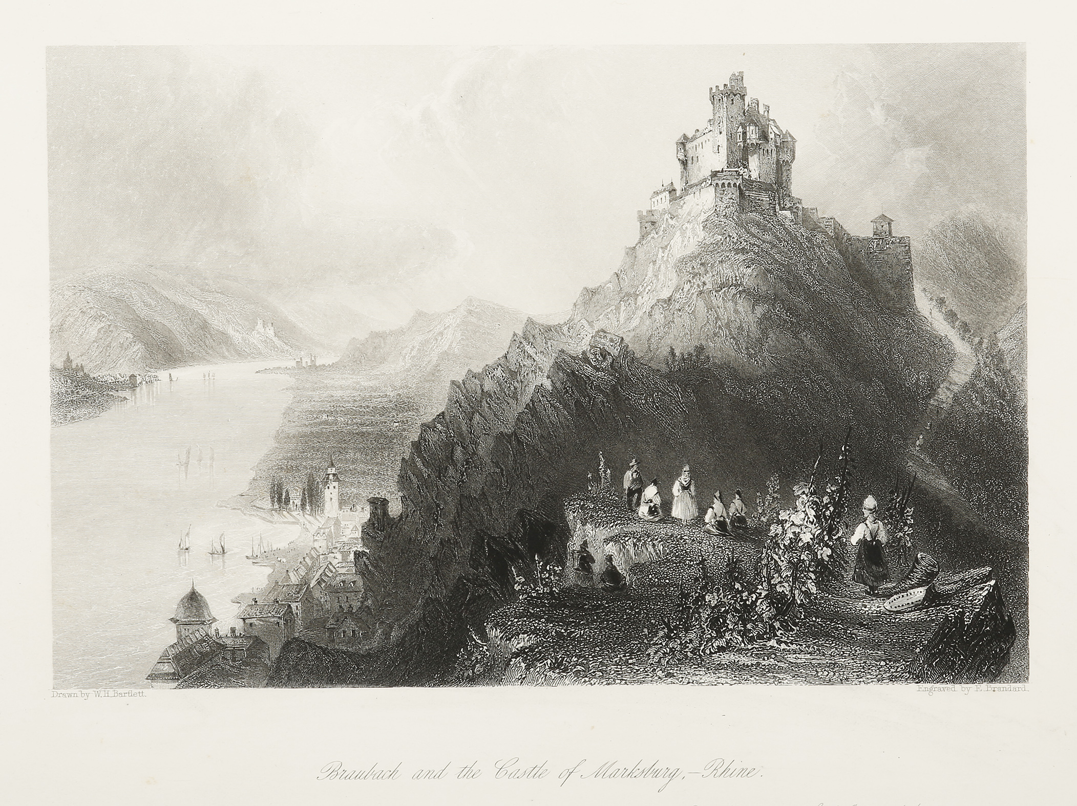 A nineteenth century engraving depicting a view of the Rhine Valley and the commanding medieval Marksburg Castle built in the twelve to thirteenth centuries.
