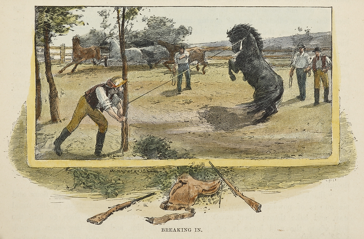 Scarce c.19th engraving of a brumby being broken in the bush.