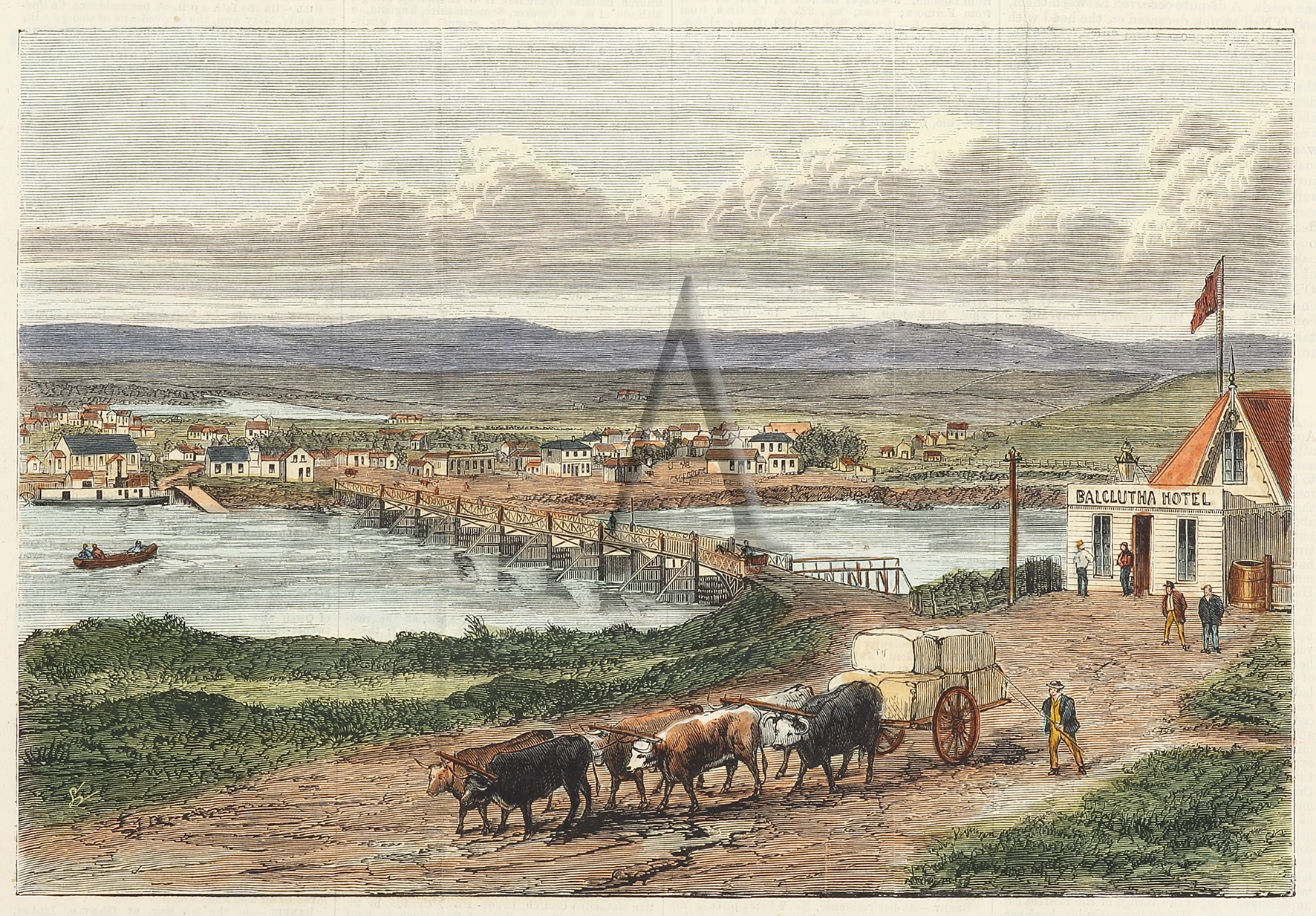 Bridge Over the Molyneux River, and Township of Balclutha, New Zealand. - Antique Print from 1872